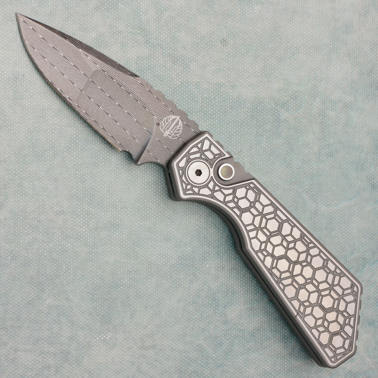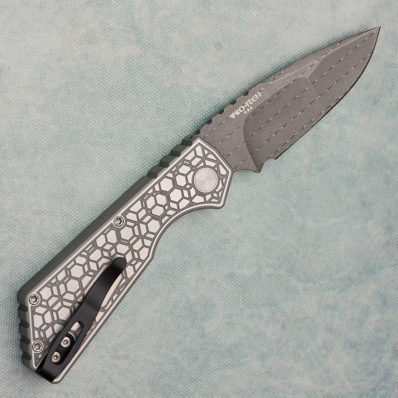 Pro-Tech Strider PT+ Auto Textured Gridlock 17-4 Steel Handle Mike Irie Hand Ground Vegas Forge Damascus Blade Blade