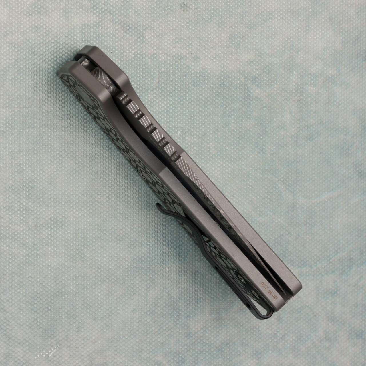 This model features gridlock textured 17-4 stainless steel handle scales. Mike Irie hand ground drop point Vegas Forge Damascus blade. The blade is marked with the ProTech and Strider logos. Satin finished hardware, pearl button and a black tip up deep carry pocket clip. Numbered 27 of 40. Brand new in box.