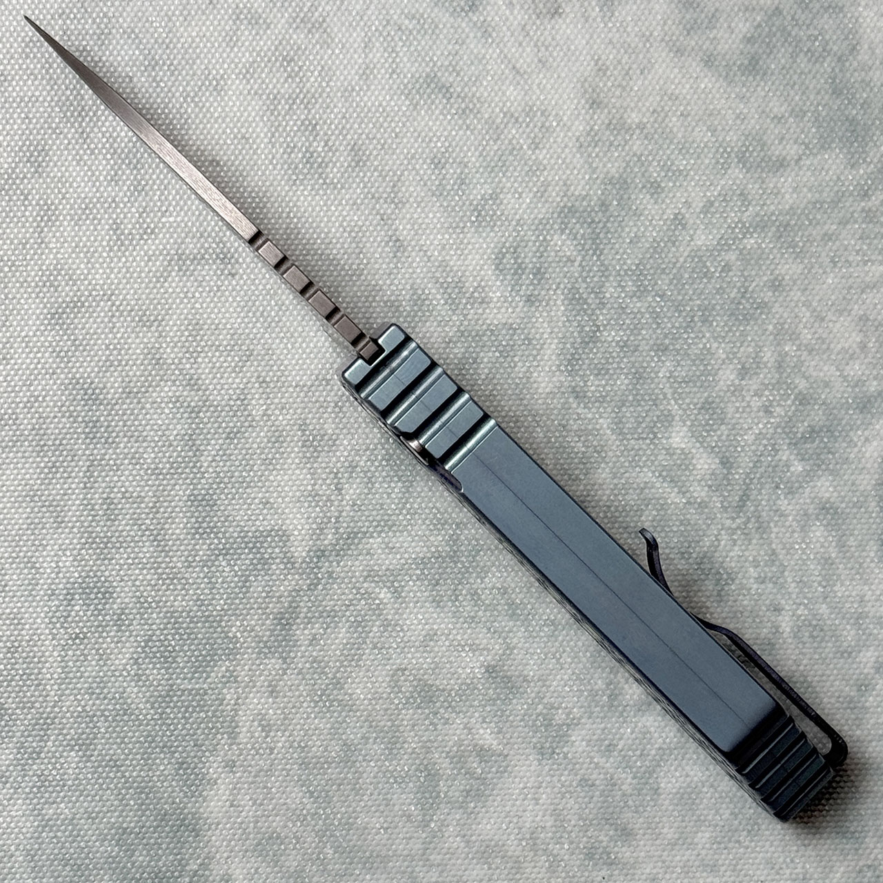 This custom model features unique anodized gridlock titanium hadles and Chad Nichols Damascus blade. It also features a custom titanium clip. Brand new in box.