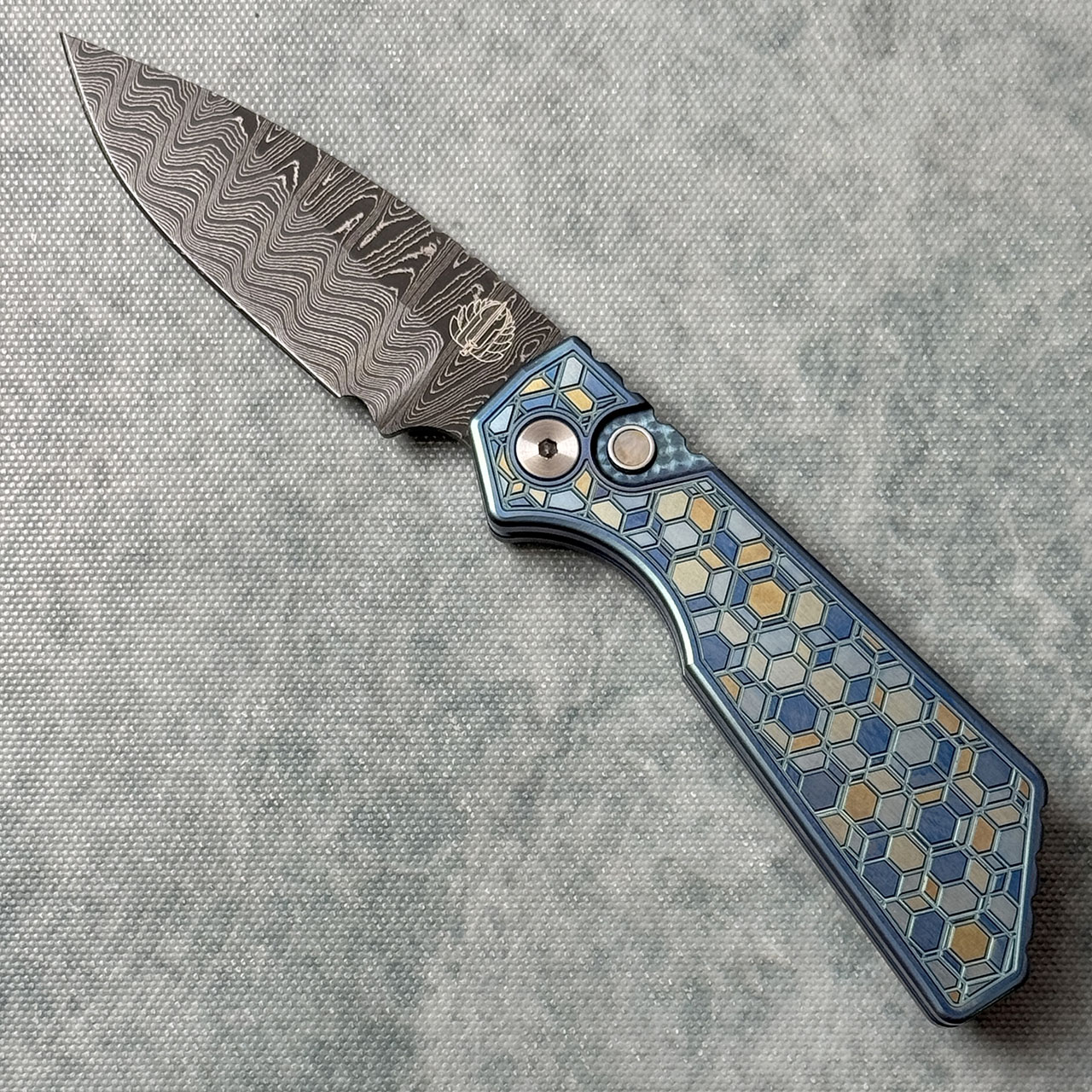 Pro-Tech Strider PT+ Auto Unique Anodized Blue/Gold Gridlock Titanium Handle Chad Nichols Damascus Blade