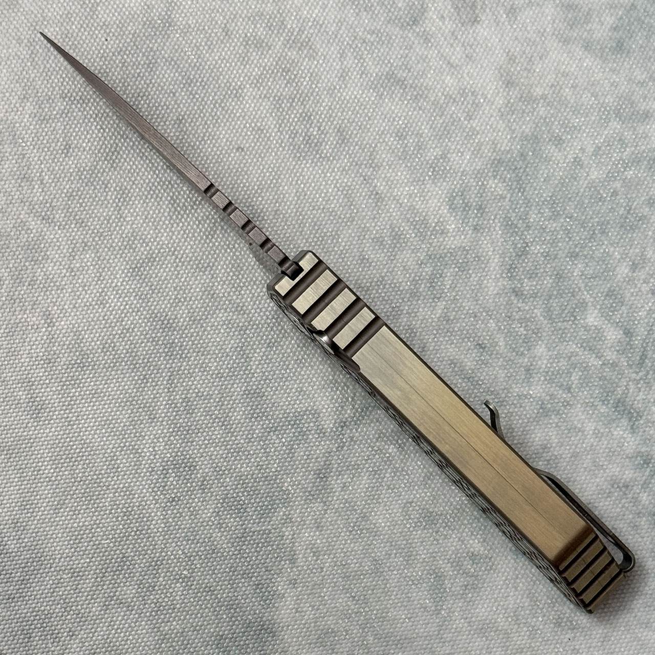 This custom model features unique anodized gridlock titanium hadles and Chad Nichols Damascus blade. It also features a custom titanium clip. Brand new in box.