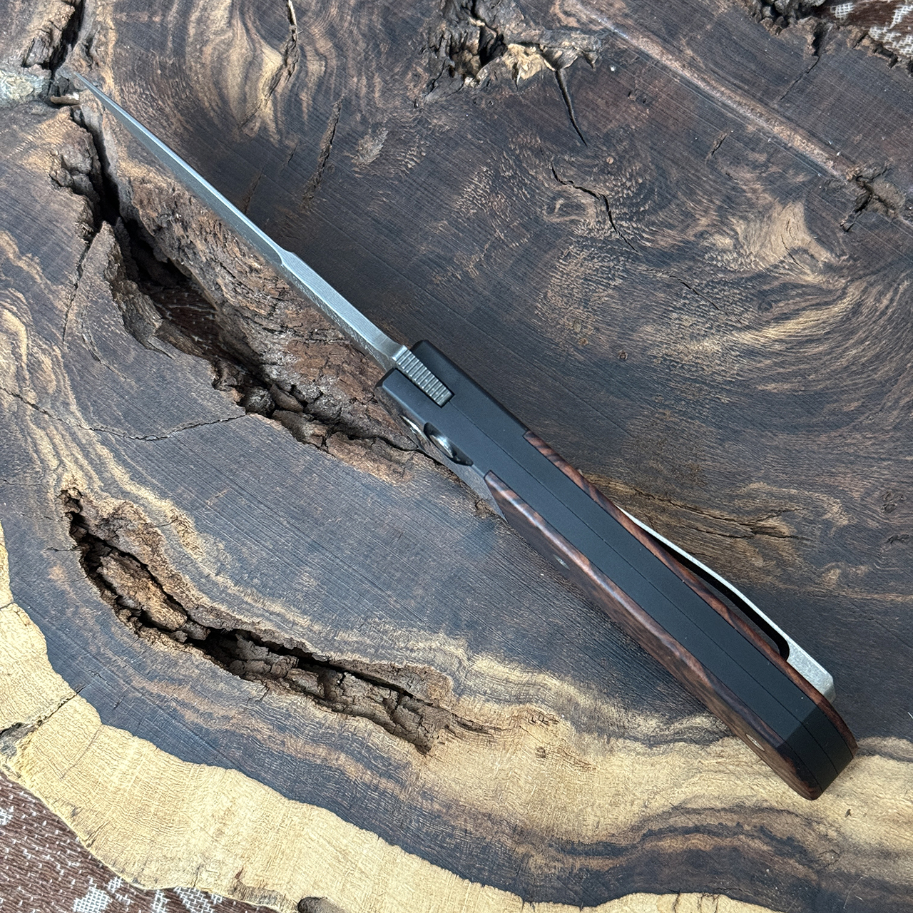 This custom model has a 416 stainless steel two tone DLC/Satin frame with desert ironwood inlays on both sides. Chad Nichols Damascus drop point blade. Satin finished hardware. Stonewash finished custom Bob Terzoula milled titanium pocket clip for tip up carry. Genuine black lip pearl inlaid push button. This is a one off configuration that was a ProTech show display model (the others had DLC clips and mosaic buttons). Like new in black presentation box with white slip, box does not have a label.