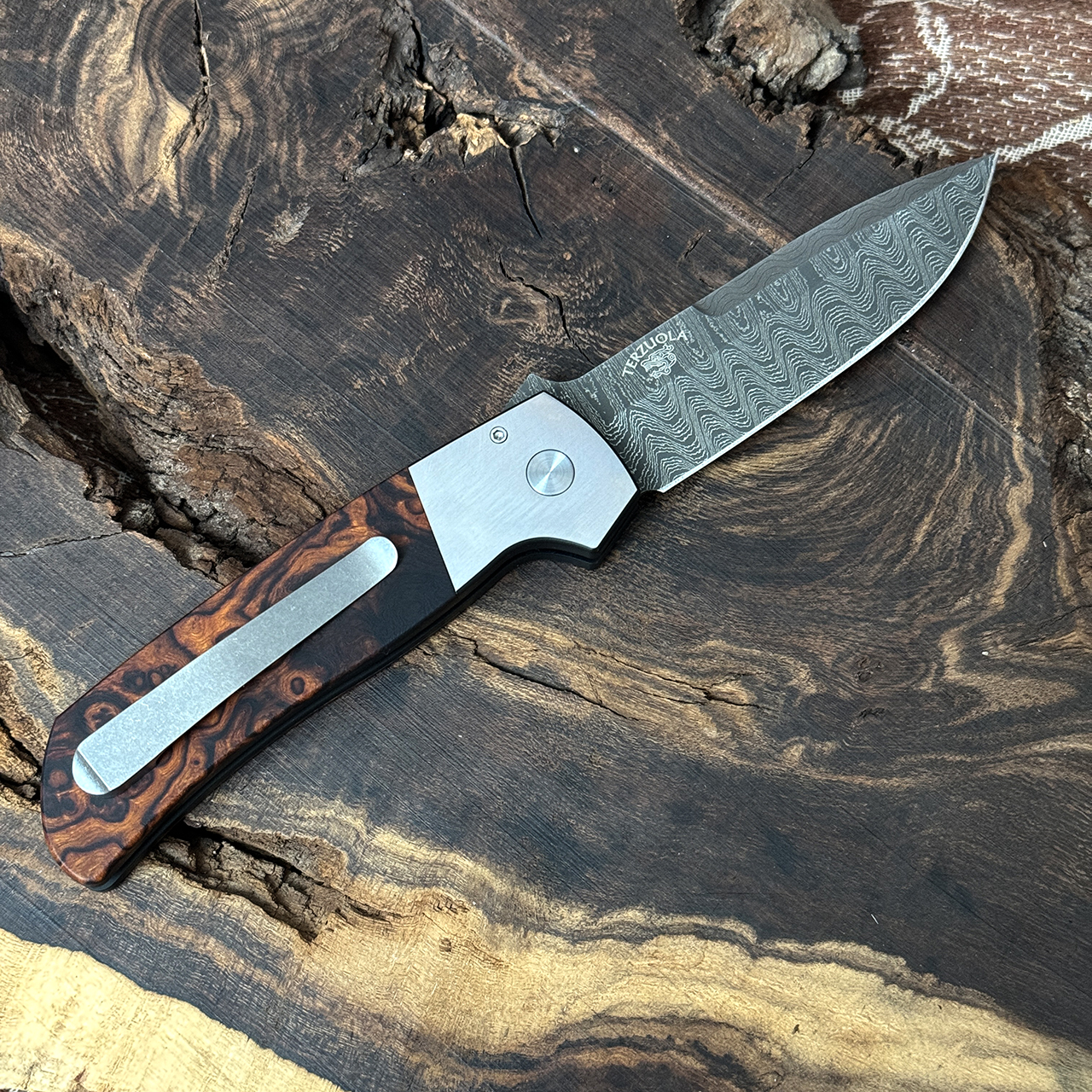 Pro-Tech Terzuola ATCF Auto Two Tone DLC Satin 416 Stainless Steel Frame w/ Desert Ironwood Inlays Chad Nichols Damascus Blade 2023.ATCF.011