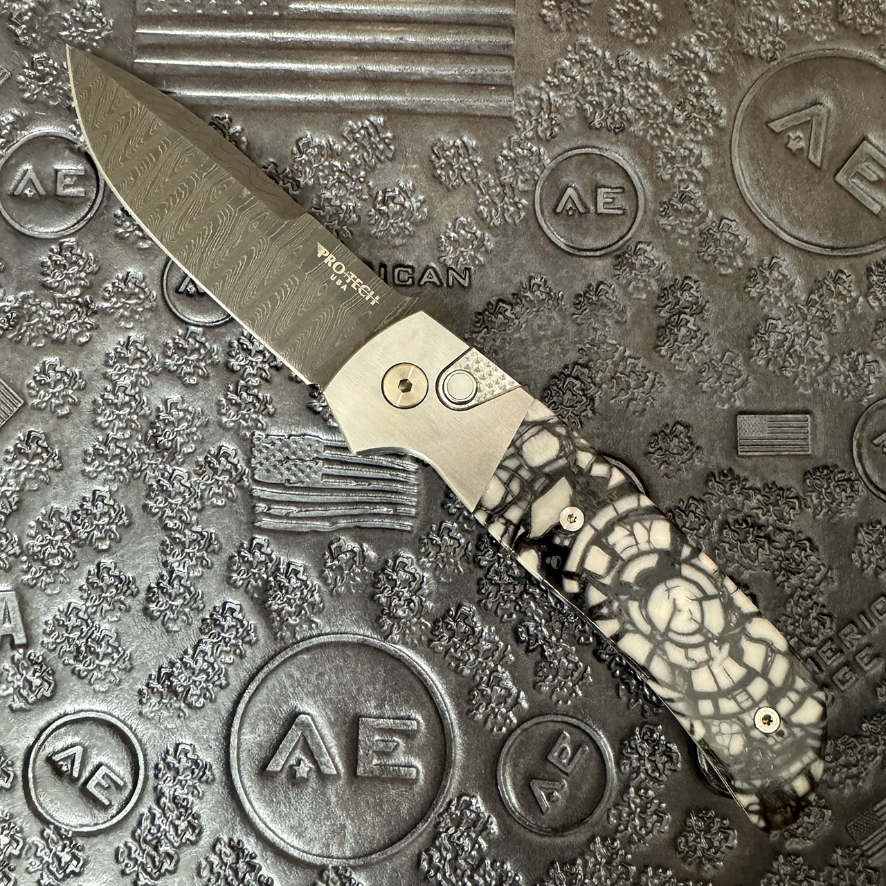 Pro-Tech Terzuola ATCF Steel Custom Auto Satin 416 Stainless Steel Frame w/ Ancient Ring Mastodon Chad Nichols Damascus Blade White MOP Button 2023.ATCF.001MASTODON