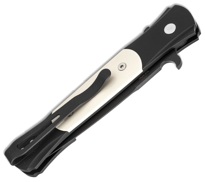 Fully 3D machined curved black aluminum handles with polished ivory micarta inlays. Black DLC finished 154-CM high carbon stainless steel bayonet blade. Push button automatic. Awesome Pro-Tech automatic knife. Comes in a nice black display box.