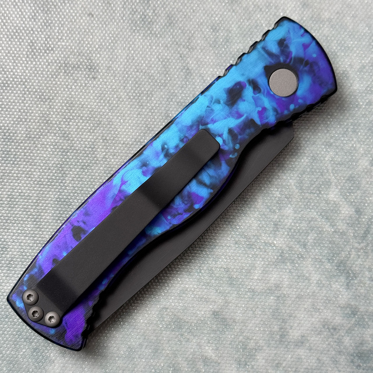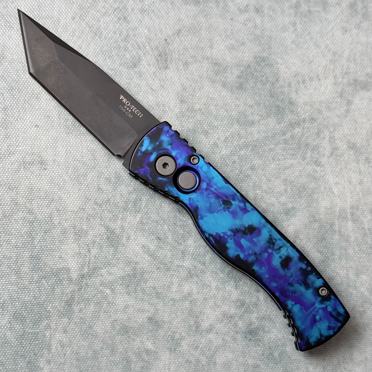 This is a Tactical Response knife featuring a jazz anodized aluminum handle. The chisel ground tanto blade is black finished 154-CM stainless steel. Bead blasted hardware and black pocket clip. This knife, like all Protech knives, fires hard and feels great in hand! Brand new in box.