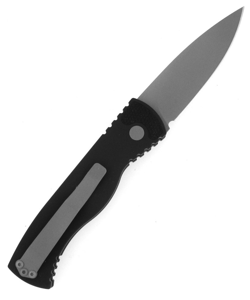 Newly redesigned and better than ever! Black anodized aluminum handle with diamond pattern knurling for better grip at any angle. Bead blasted 154-CM high carbon stainless steel spear point blade with a plain cutting edge. This knife really hits hard. Bead blasted hardware and removable pocket clip for tip up carry. Awesome switchblade by American made Pro-Tech knives. Brand new in box.