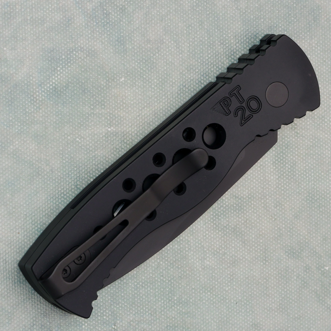 This 20th Anniversary limited edition model features a throw back styled skeletonized black anodized 6061-T6 aluminum handle scales and the PT20 Anniversary logo on the back. DLC finished premium CPM-MagnaCut stainless steel spear point blade. DLC finished hardware and black DLC finished tip up deep carry pocket clip. Black lip mother of pearl inlaid push button. Brand new in box.