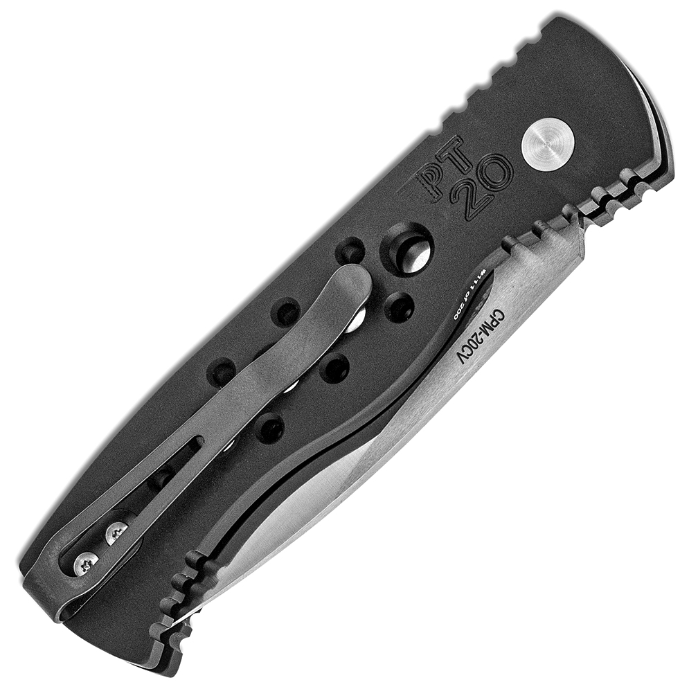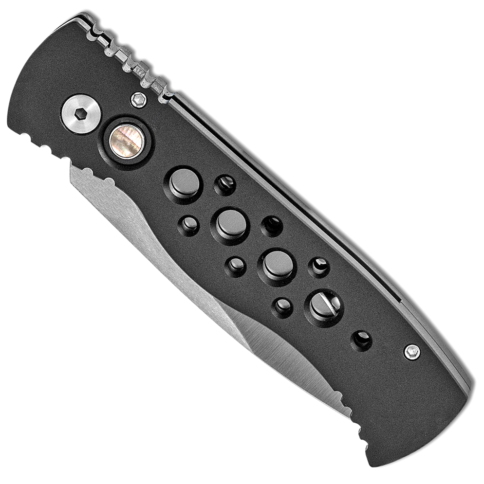This 20th Anniversary limited edition model features a throw back styled skeletonized black anodized 6061-T6 aluminum handle scales and the PT20 Anniversary logo on the back. Satin finished premium CPM-20CV stainless steel spear point blade. Satin finished hardware and black DLC finished tip up deep carry pocket clip. Black lip mother of pearl inlaid push button. Individually serial numbered of only 200 made. Brand new in ProTech 20th Anniversary box with drawstring pouch.