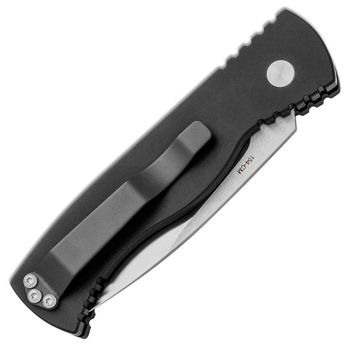 This model features a solid black anodized 6061-T6 aluminum handle. Satin finished 154-CM stainless steel spear point blade. Satin finished hardware and black DLC finished pocket clip. Includes a ProTech nylon sheath. Brand new in box.