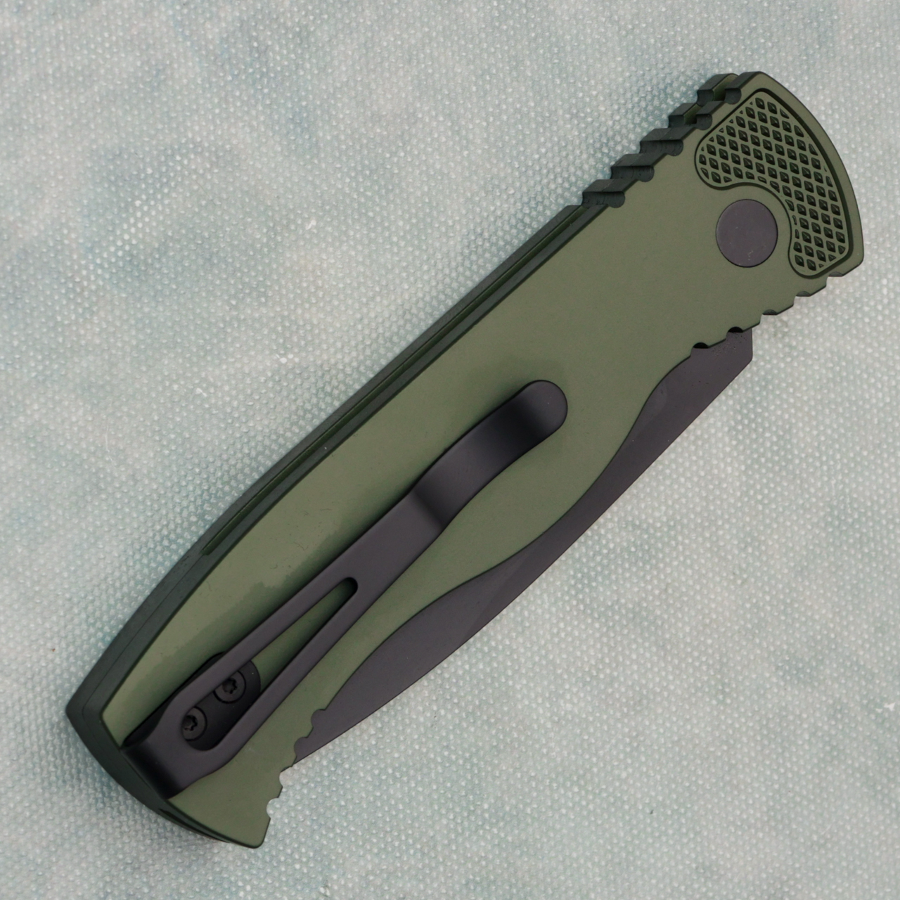 This model features a solid green anodized 6061-T6 aluminum handle with textured corners. DLC black CPM-MagnaCut stainless steel spear point blade. Black deep-carry pocket clip. Brand new in box.