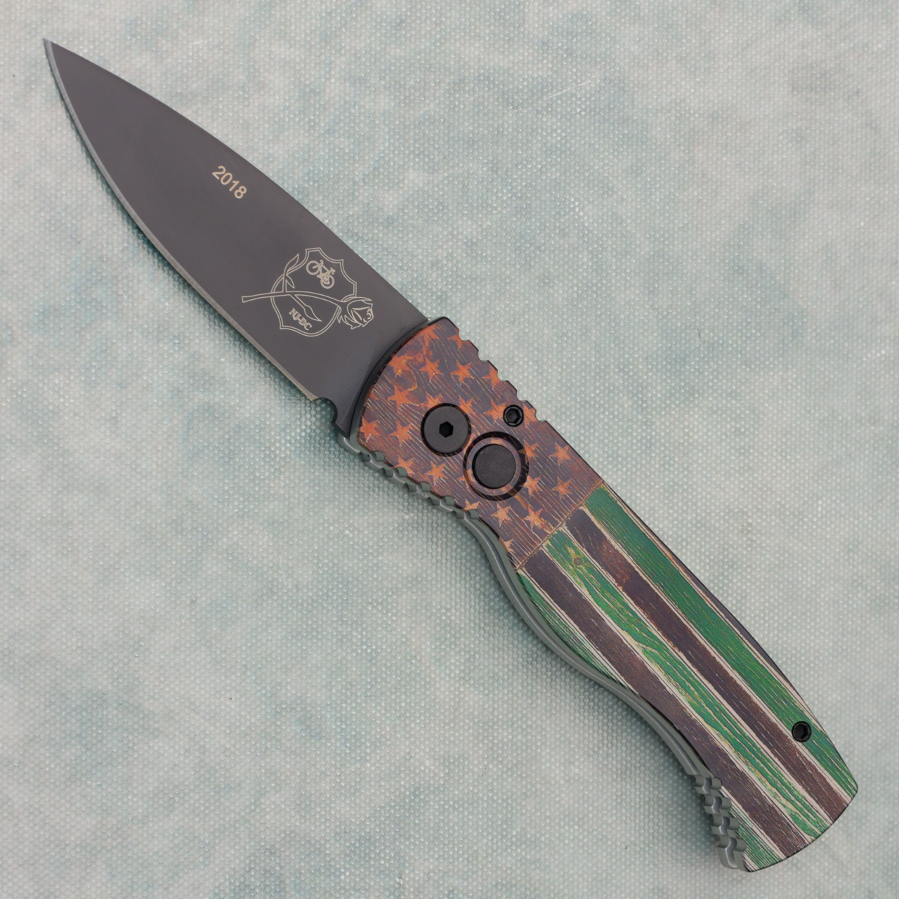 This model features a pk flag anodized 6061-T6 aluminum handle. Black 154-CM spear point blade with Bicycle and rose and NJ-DC Shield, with Pro-Tech logo on the back. Brand new in box.