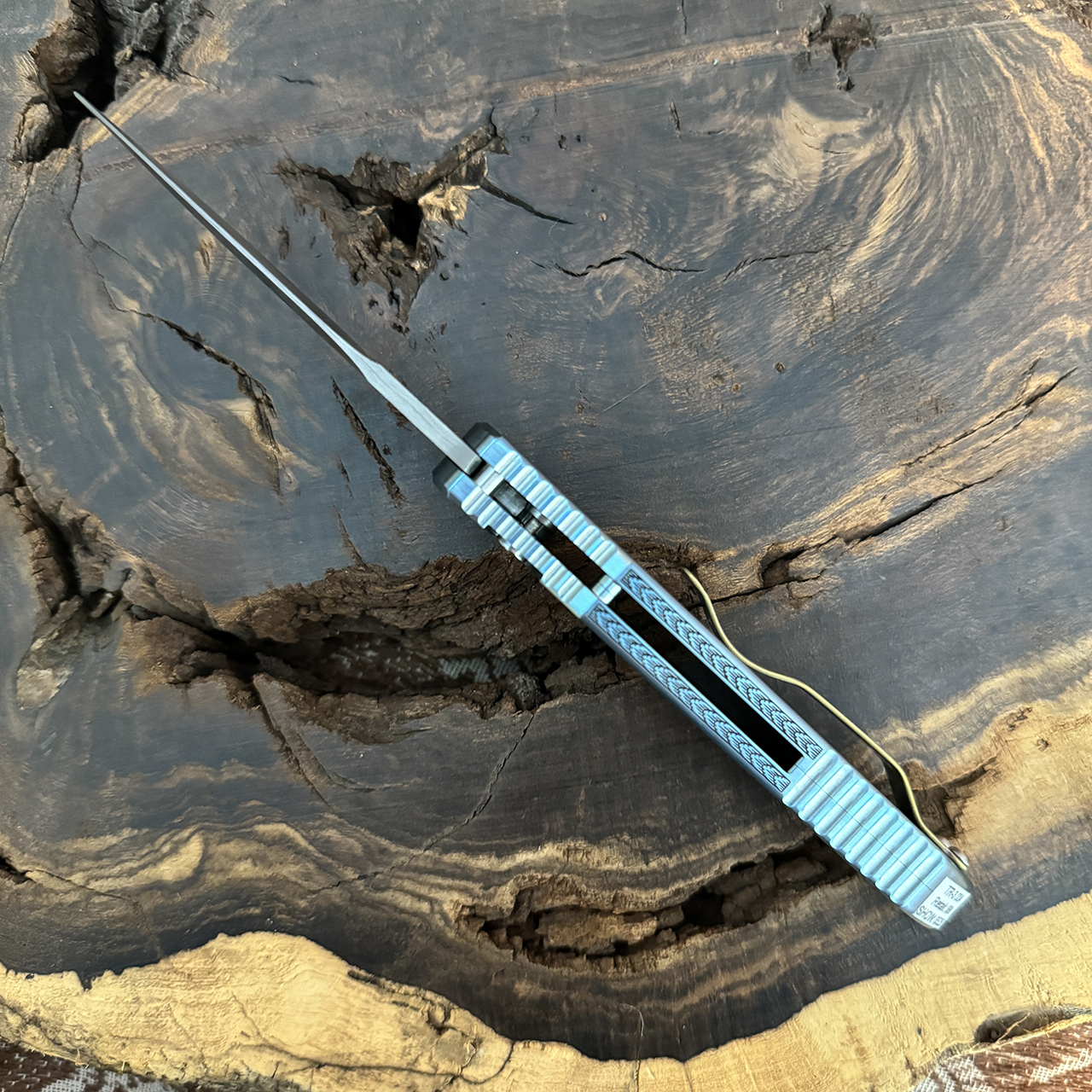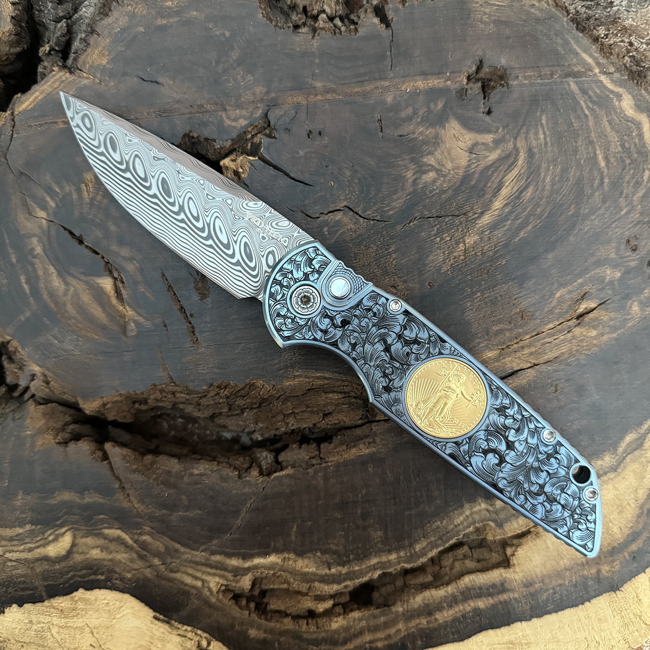 PPro-Tech TR-3.004 Ultimate Custom Titanium 2023 Blue Anodized Titanium Frame w/ Bruce Shaw Hand Engraving and Inset American Gold Eagle Coin Mike Irie Handground Damasteel Blade and Pearl Button