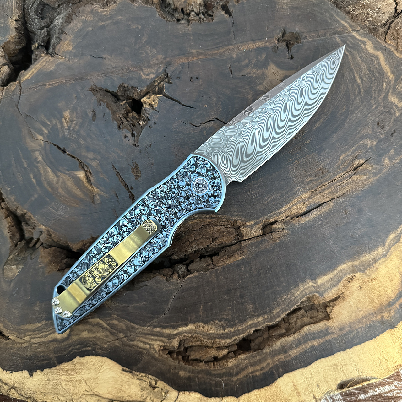 This limited edition custom model features a blue anodized titanium frame that has been fully engraved by Mater Engraver, Bruce Shaw with an inset American Gold Eagle Coin. It features a genuine mother of pearl push button and an engraved gold anodized titanium pocket clip. Mike Irie Hand Ground Damasteel Hakkapella Blade. From CCKS Fall 2023. Brand new in box.