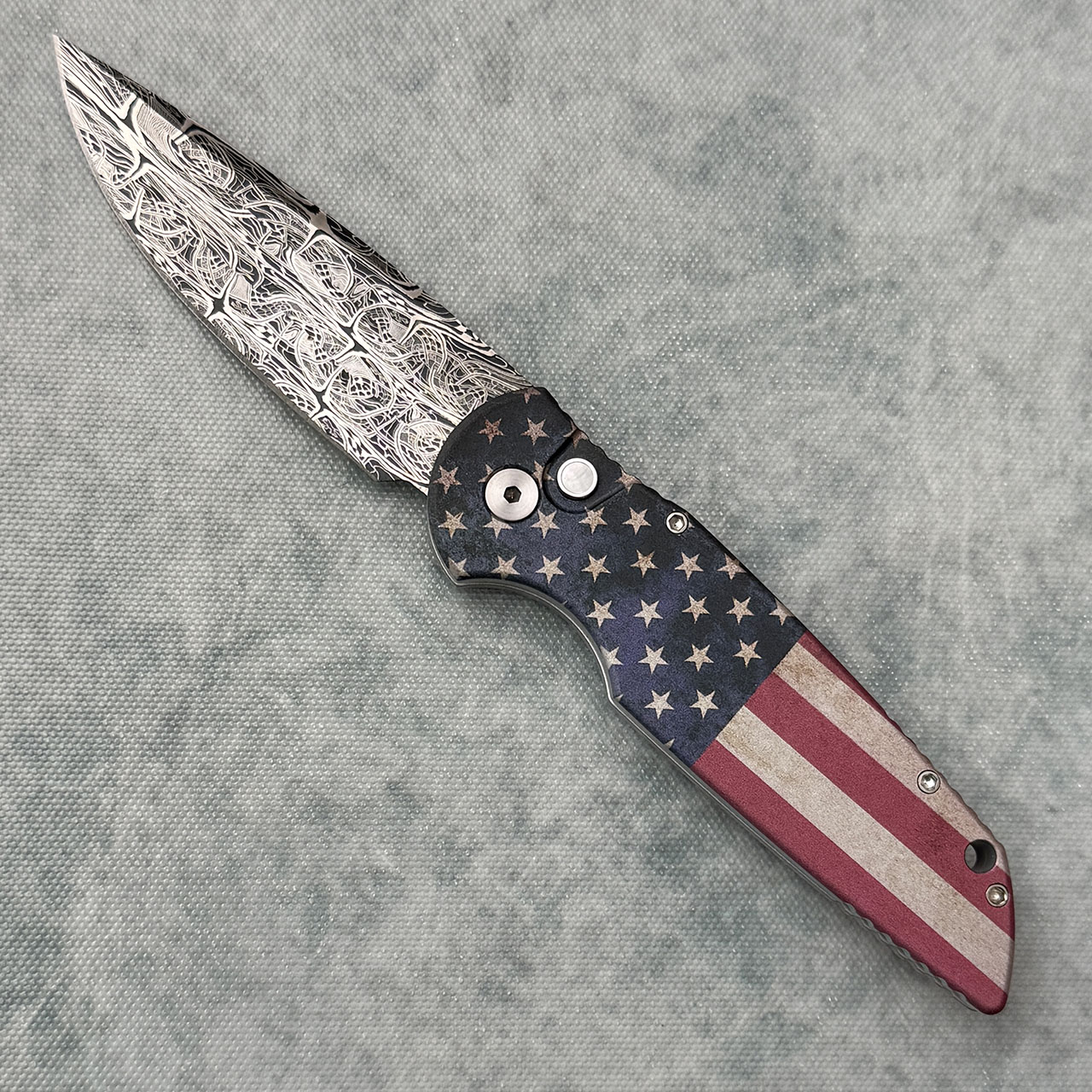 Pro-Tech TR-3 Antique Flag Aluminum Handle Eggerling Carbon Mosaic Damascus Blade Pearl Button