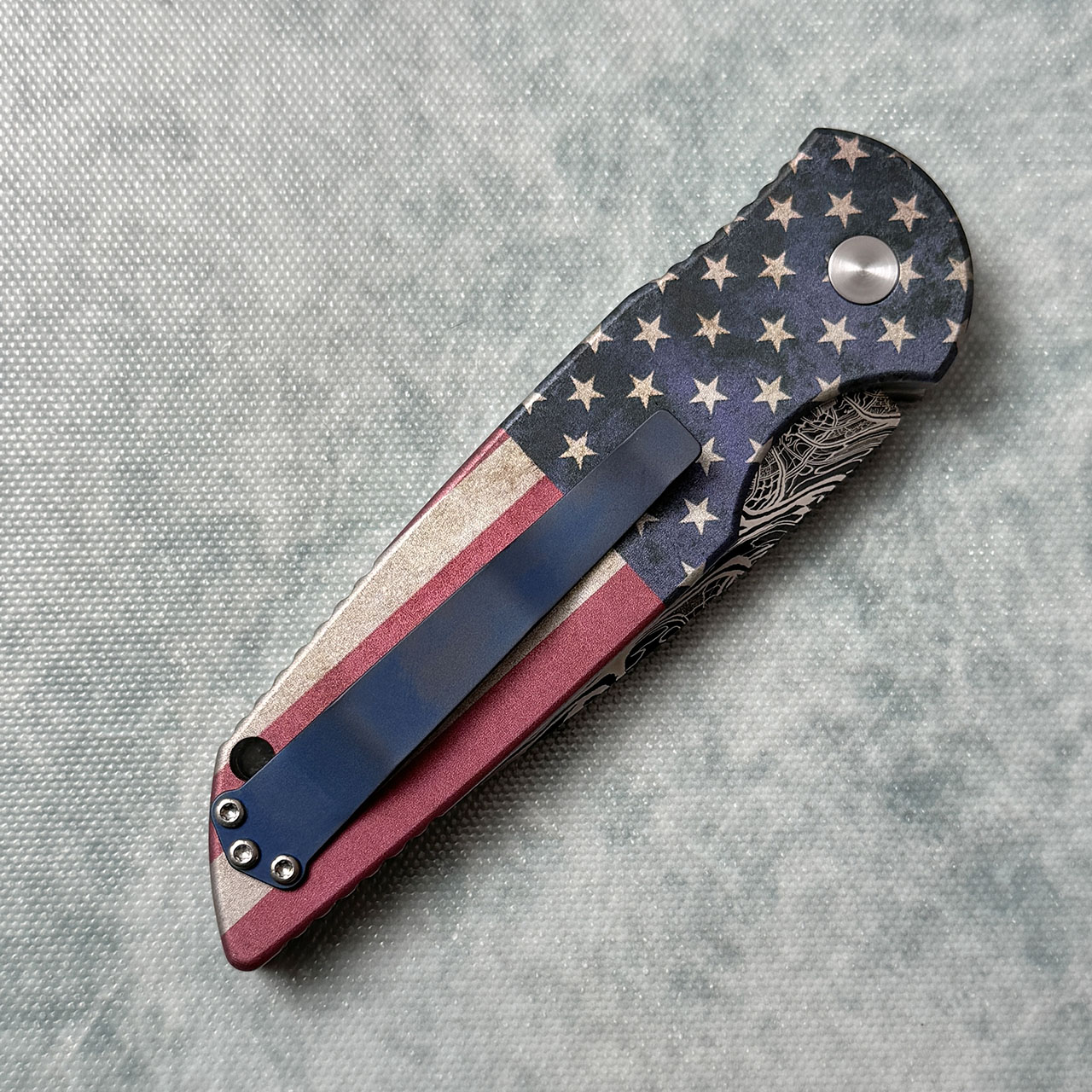 This limited edition custom model features antique flag aluminum handle scales. Eggerling carbon mosaic damascus drop point blade. Blue pocket clip for tip up carry. Lanyard hole. Mother of pearl inlaid push button. The TR-3 is one of our long time favorite knives! New in box.