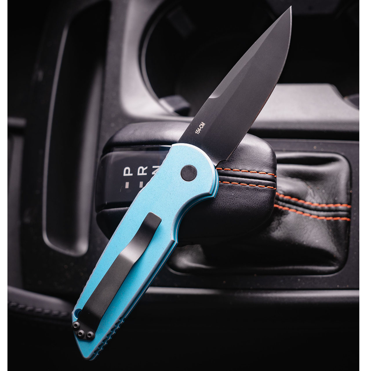 Pro-Tech TR-3 Battleworn Tiffany Blue Grooved Handle DLC Blade Pearl Button TR-3 BT BW T. BLUE LTD