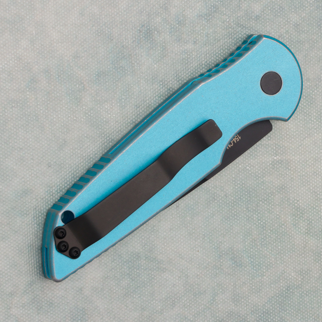 This model features grooved Battleworn Tiffany blue anodized 6061-T6 aluminum handle scales with a abalone inlay by Jack Harris. DLC finished 154-CM stainless steel drop point blade. Black lip pearl button. Black finished hardware and pocket clip for tip up carry. Lanyard hole. Warranty void due to modification. Like new in box.