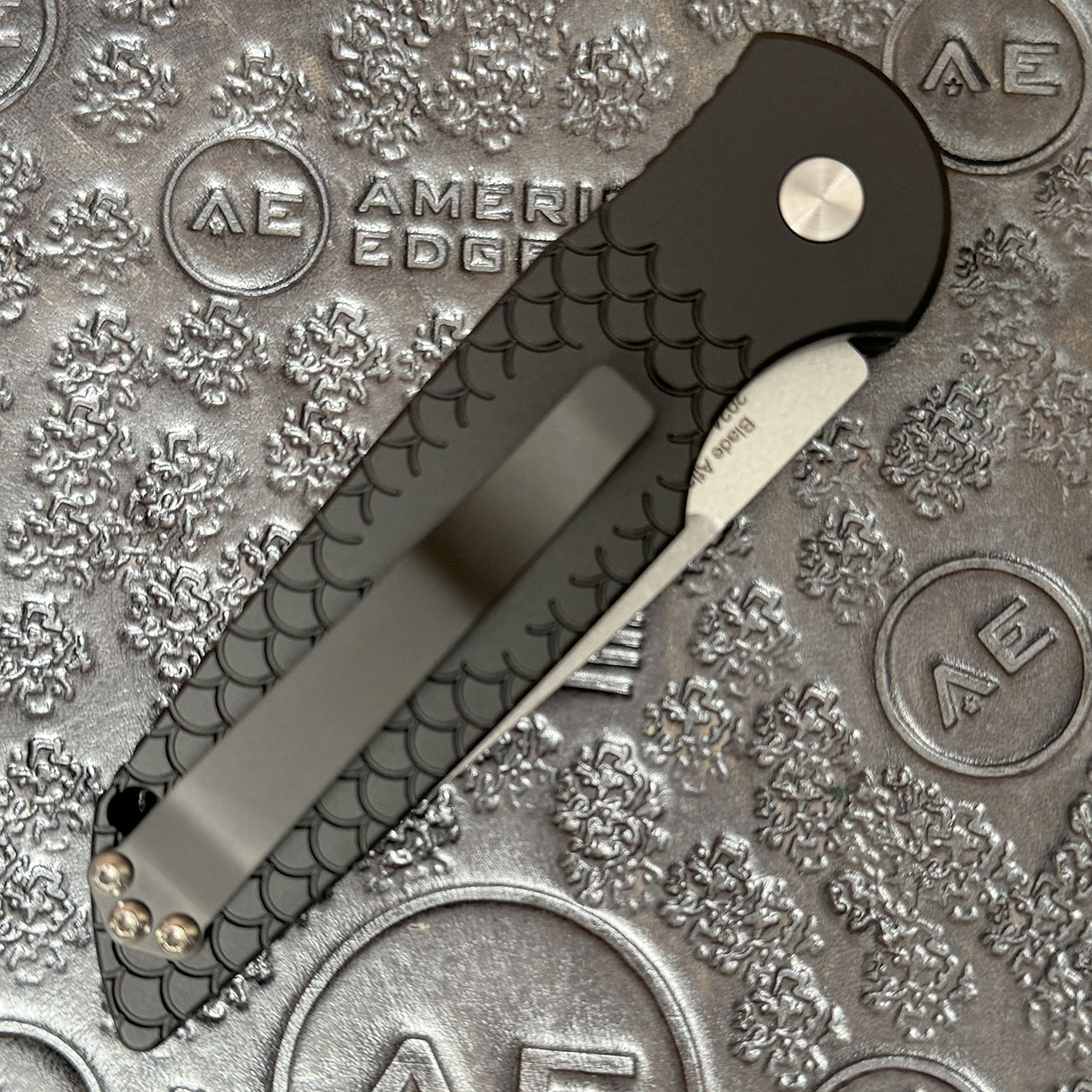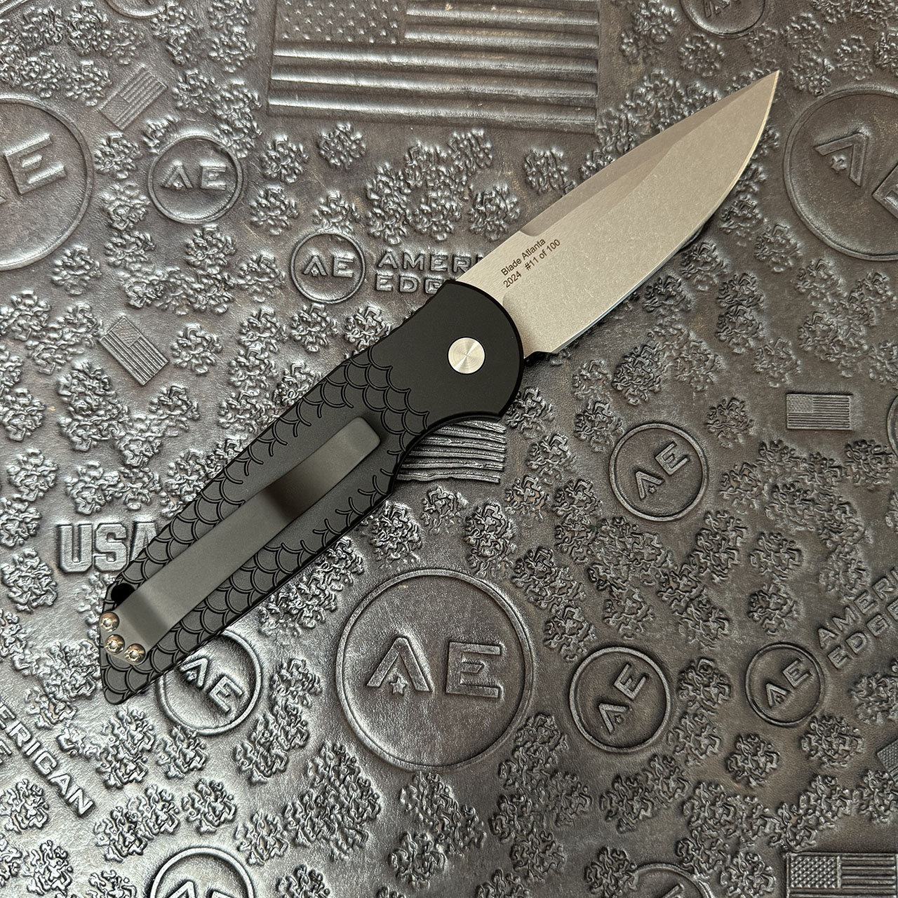 This limited Blade Show 2024 model features fish scale machined textured black anodized 6061-T6 aluminum handle scales. Solid one piece stainless steel safety switch. Stonewash/Satin finished 154CM stainless steel drop point blade. Gold lip pearl push button. Satin finished hardware and a black DLC finished pocket clip for tip up carry. Numbered for Blade Show 2024 #XX/100. Brand new in box.