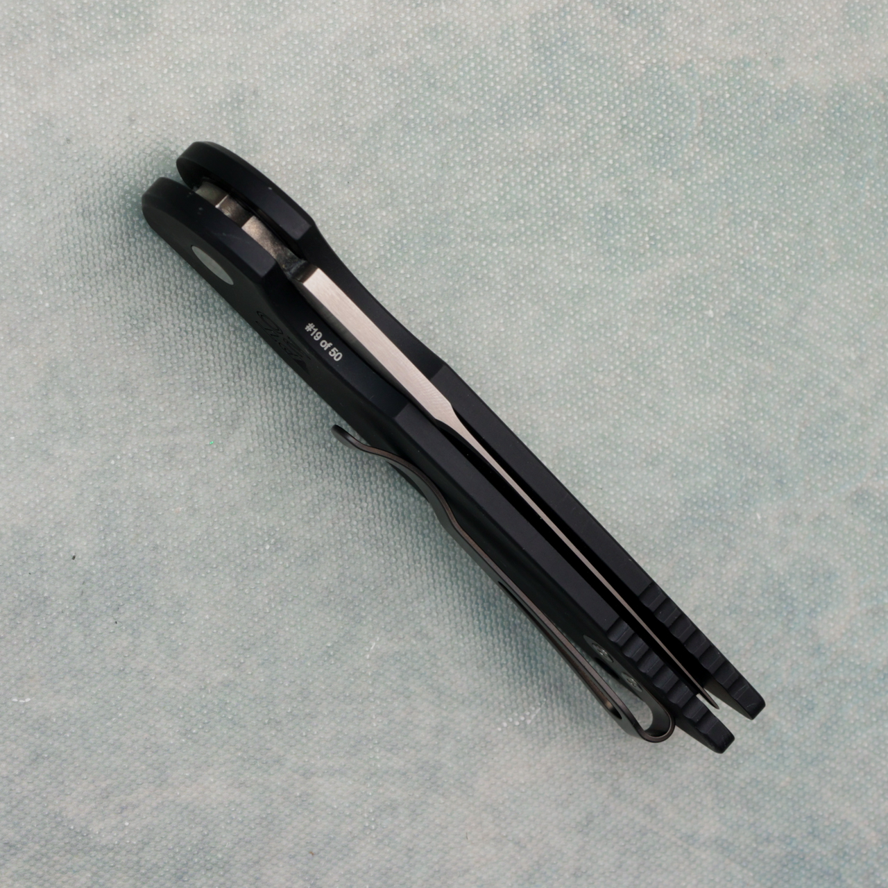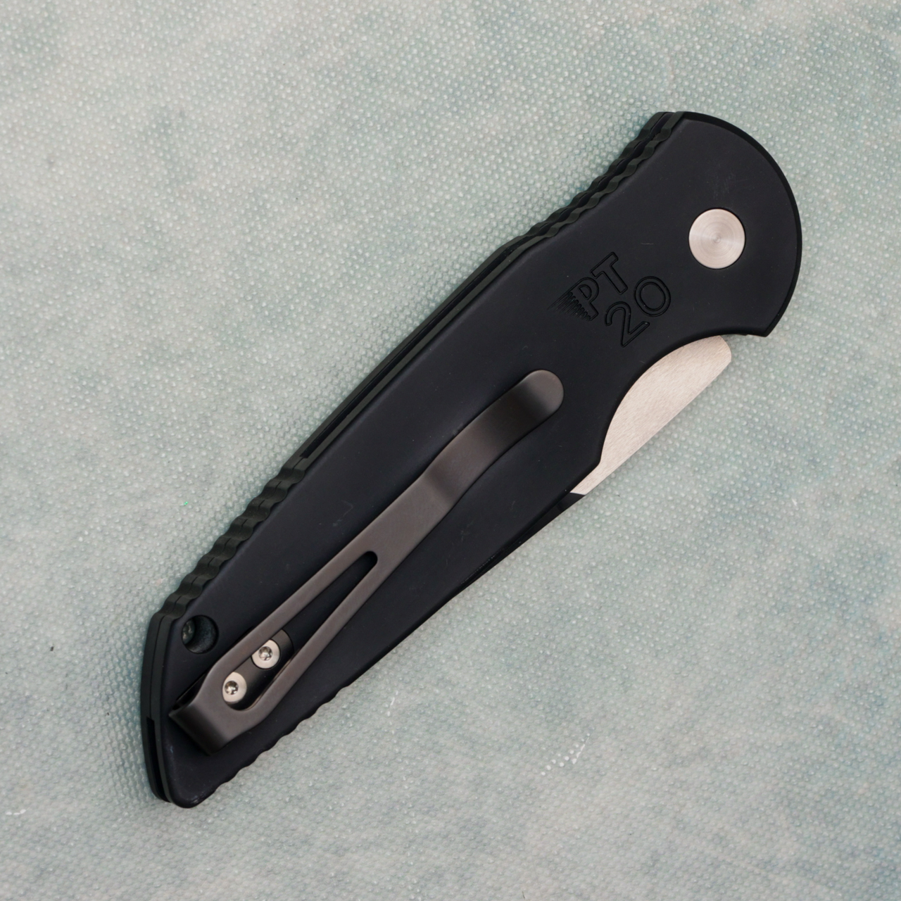 This 20th Anniversary limited edition model features black anodized 6061-T6 aluminum handle scales with machine milled grip texture on the front and the PT20 Anniversary logo on the back. Mike Irie hand compound ground mirror polished 154-CM stainless steel drop point blade. Satin finished hardware and black DLC finished pocket clip for tip up carry. Black lip mother of pearl inlaid button. Individually serial numbered #19 of only 50 made. Like new in ProTech 20th Anniversary box with drawstring pouch.