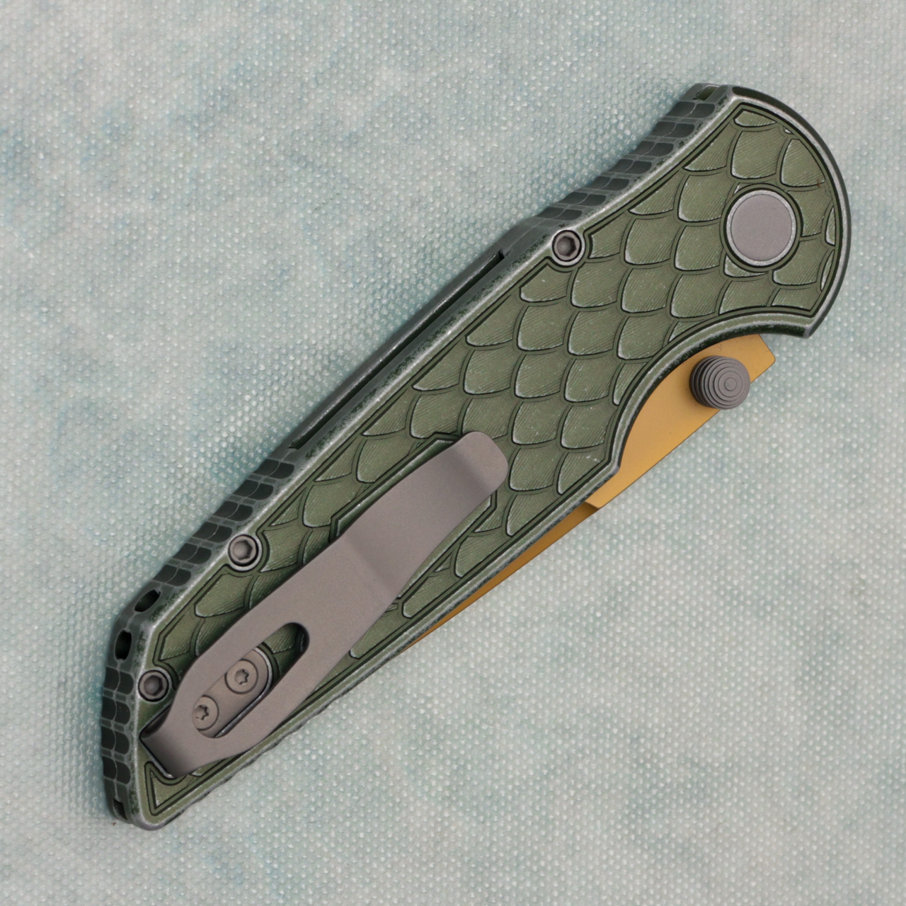 This model features battleworn reptile textured green anodized 7075 aluminum handle scales. Tan PVD finished CPM-S35VN stainless steel blade. Bead blast hardware, button, and pocket clip for tip up carry. Brand new in box.
