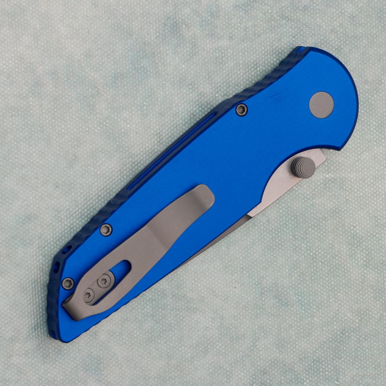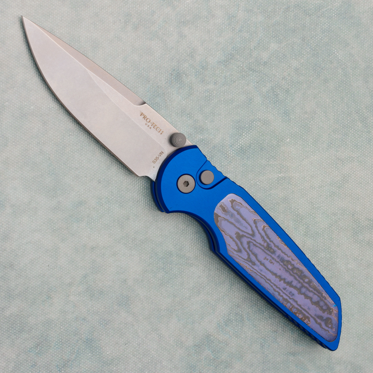 Pro-Tech TR-3 Integrity Button Lock Blue Handle w/ Aftermarket Chad Nichols Zircuti Inlay Stonewash Blade (Consignment)