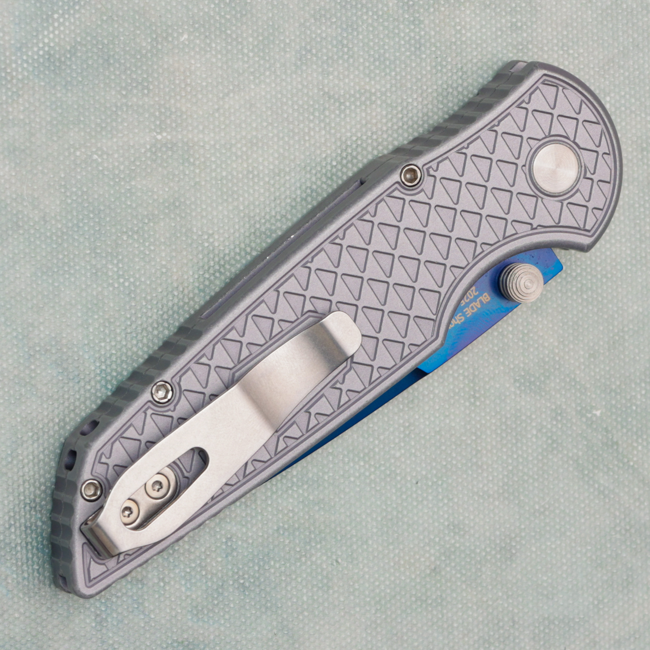 This custom model features relic textured grey battle worn aluminum scales. Sapphire blue finished CPM-S35VN stainless steel blade. Satin hardware and satin pocket clip for tip up carry. Abalone button. Like new in wrong box.
