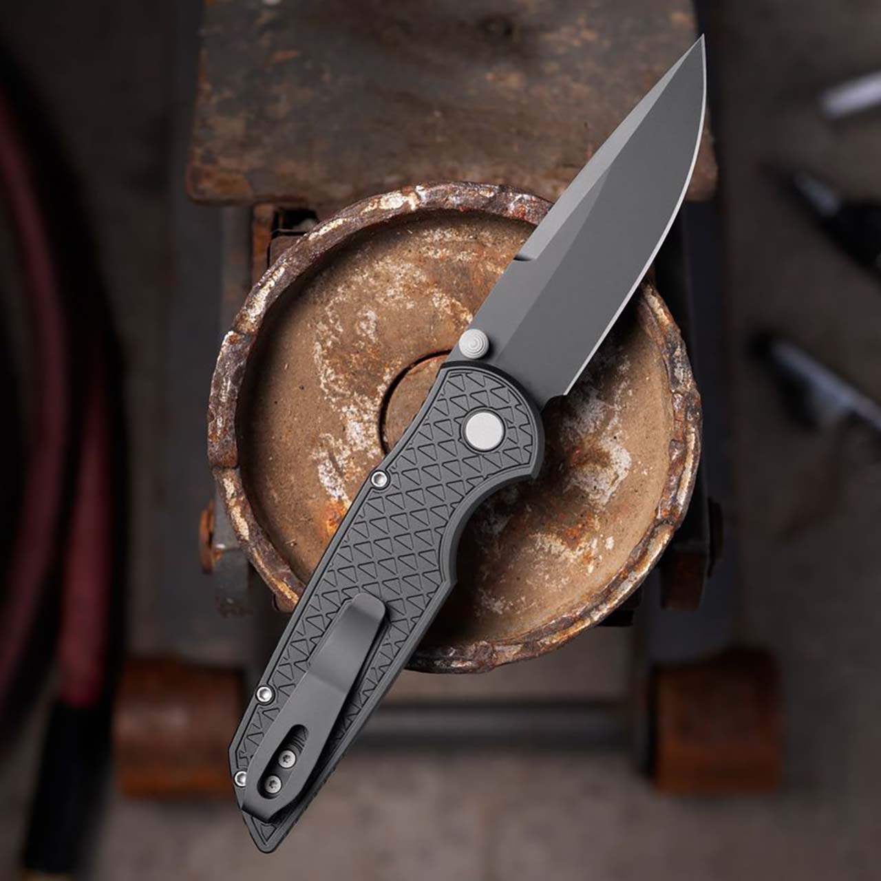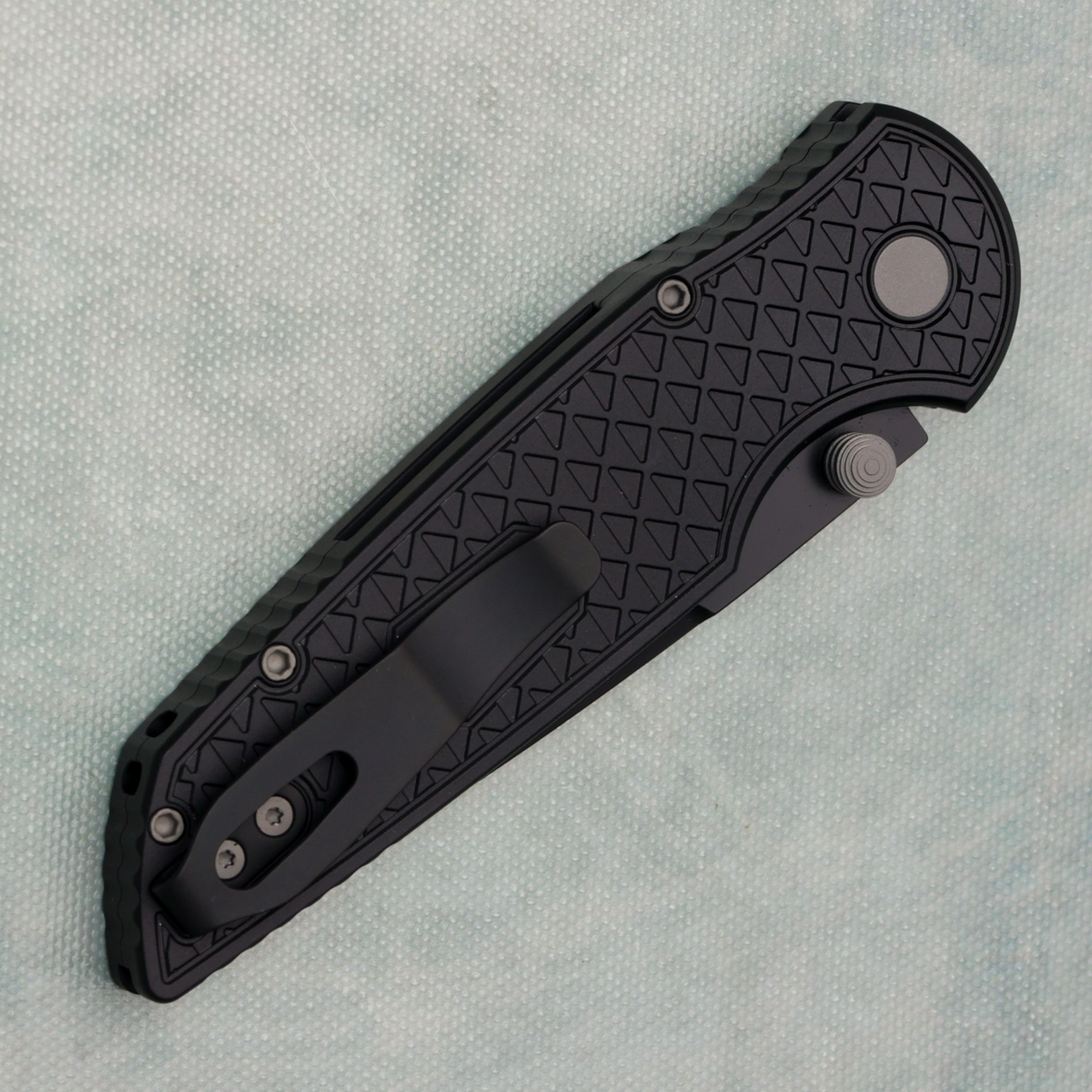 This model features relic textured black anodized 7075 aluminum handle scales. DLC finished CPM-MagnaCut stainless steel blade. Bead blast hardware, button, and DLC black pocket clip for tip up carry. Brand new in box.