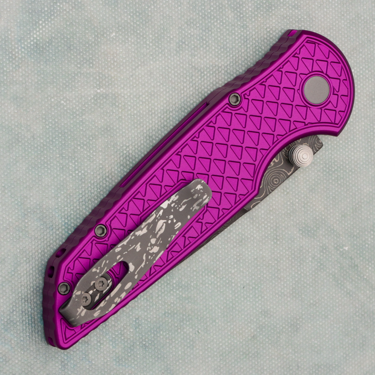 This model features relic textured purple anodized 7075 aluminum handle scales. Damascus blade from a different knife. Blasted hardware, button, and patterned pocket clip for tip up carry. Like new in box.