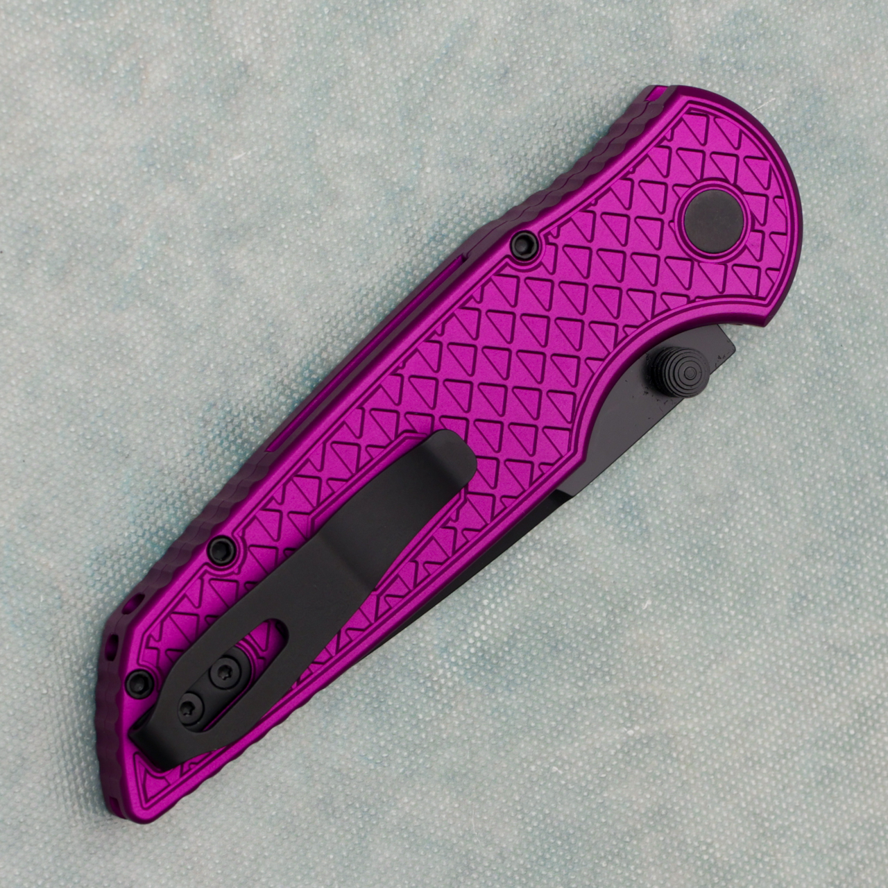 This model features relic textured purplee anodized 7075 aluminum handle scales. DLC finished CPM-MagnaCut stainless steel blade. Black hardware, black lip pearl button, and black pocket clip for tip up carry. Brand new in box.