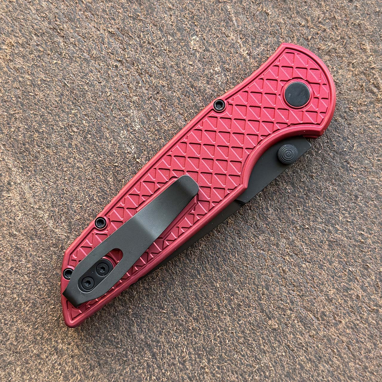 This model features relic textured red anodized 7075 aluminum handle scales. DLC finished CPM-MagnaCut stainless steel blade. DLC hardware, black lip pearl button. Numbered xx of 65. Brand new in box.