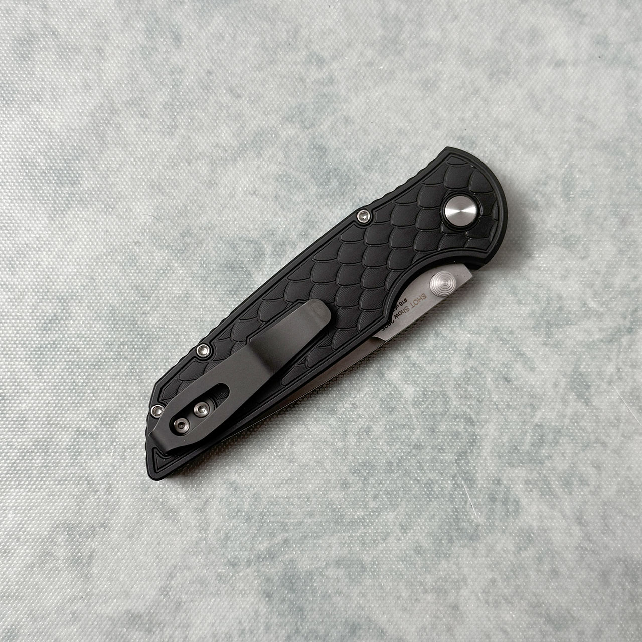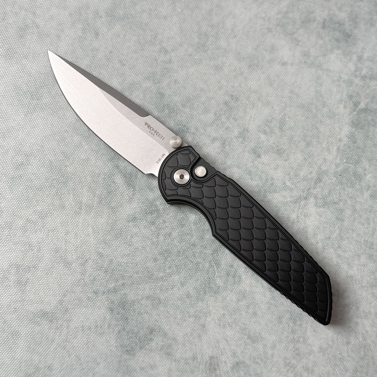 This model features reptile textured black anodized 7075 aluminum handle scales. Stonewash finished CPM-S35VN stainless steel blade. Satin hardware, gold lip pearl button, and black DLC finished pocket clip for tip up carry. Brand new in box.