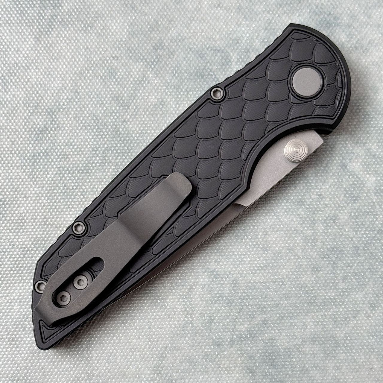 This model features reptile textured black anodized 7075 aluminum handle scales. Stonewash finished CPM-S35VN stainless steel blade. Blasted hardware, and button, and black DLC finished pocket clip for tip up carry. Brand new in box.