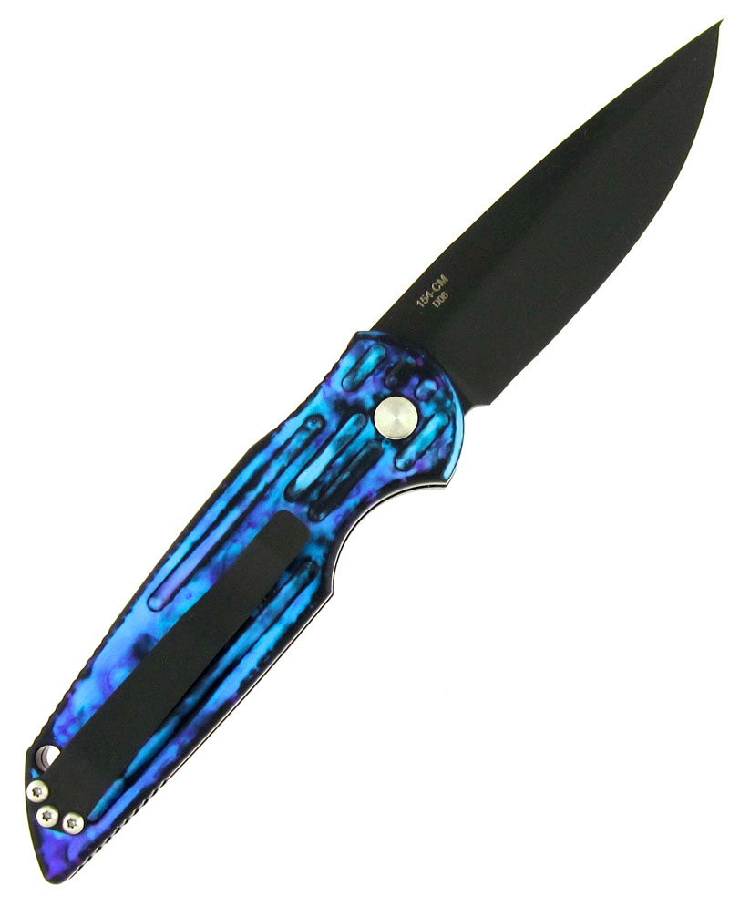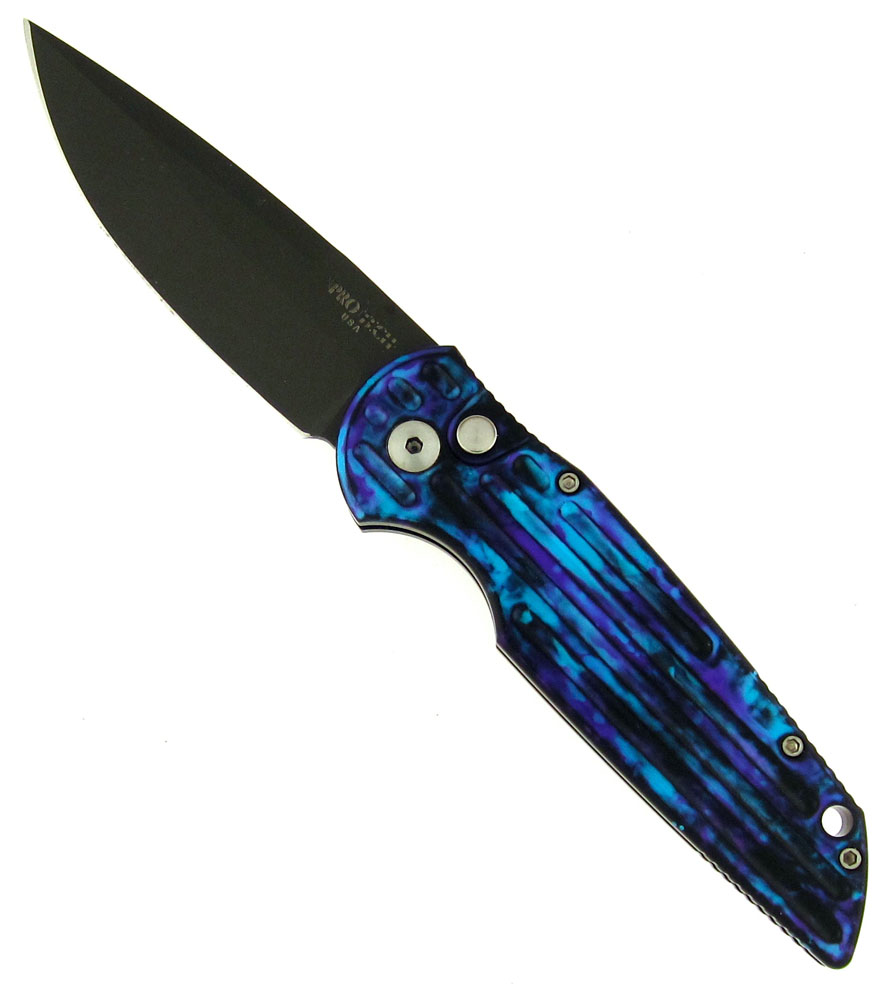 One of Pro-Tech's most popular knives with Law Enforcement Professionals and Military. The TR-3 offers a muli-task 3.5 blade and a very slender thoughtfully designed handle. This one features a multi color Jazz blue anodized grooved 6061-T6 aluminum handle scales. Black finished 154-CM stainless steel blade. Satin finished hardware and black pocket clip. Lanyard hole. One of my personal favorite models with that same Pro-Tech action we all love. Brand new in box.
