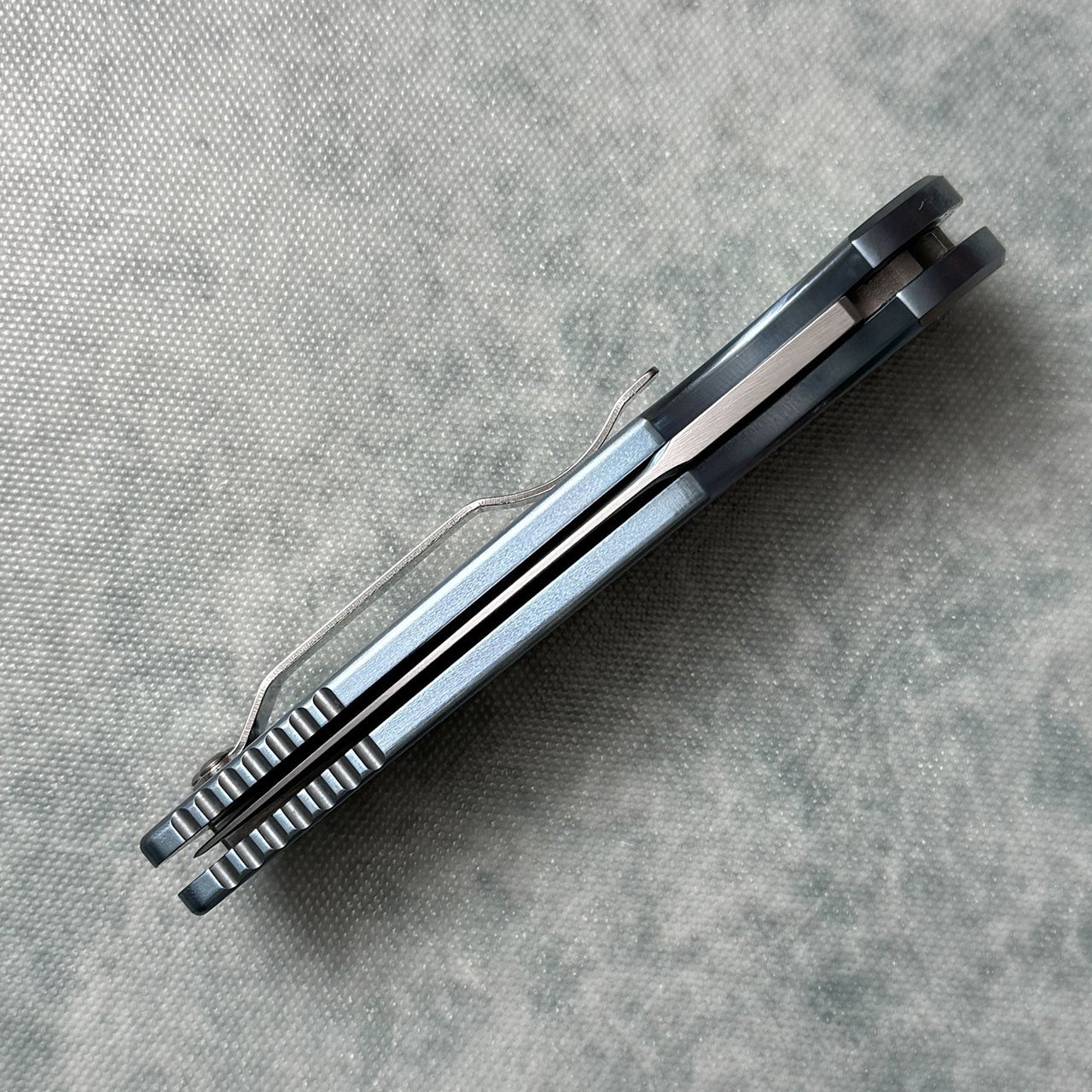 This model features solid hand satin titanium handle scales with blue chamfers. Satin finished 154-CM stainless steel drop point blade. Satin finished hardware and pocket clip for tip up carry. Pearl Button. Lanyard hole. Brand new in box.