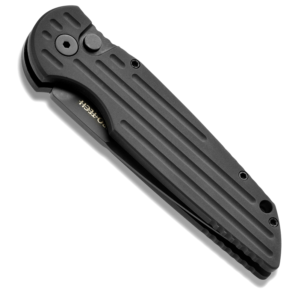 This limited edition model features grooved black anodized 6061-T6 aluminum handle scales. The back of the frame is marked TR-3 SWAT. Black DLC finished 154-CM stainless steel drop point blade with a partially serrated cutting edge. All black tactical finished hardware and black DLC finished pocket clip. Includes Pro-Tech nylon sheath. Brand new in box.