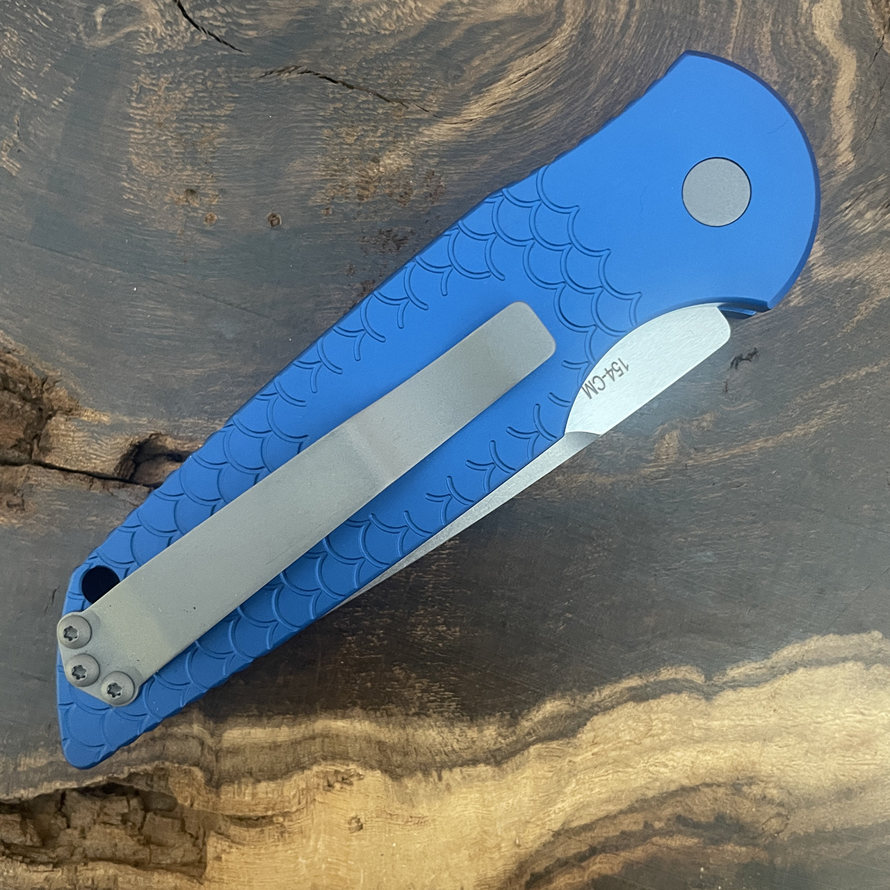 Pro-Tech Tactical Response 3 X1 solid blue aluminum fish scales are perfect for grip traction and appearance. Pro-Tech's Type 3 anodizing is “hardcoat” using sulfuric acid or mixed chemistry electrolytes is flawless. The 154CM blade is centered and has a great factory edge. Pro-Tech TR-3 coil spring action is consistent, fast and strong, extremely satisfying. Pro-Tech TR-3 fits an XL Mechanix glove size hand perfectly. Definitely recommended Pro-Tech and AEK for knife purchases. AEK shipping is fast and efficient, communication is beyond acceptable. A handwritten note from Brittney saying "Thank you" is a nice touch. I've purchased four additional Pro-Tech hard to get high end knives from AEK. Jordan and LeNeigh are awesome owners of American Edge Knives. (AEK) selection of Pro-Tech Knives are outstanding and great prices. AEK www site is well suitable for locating specific knives from a wide range of manufacturers.