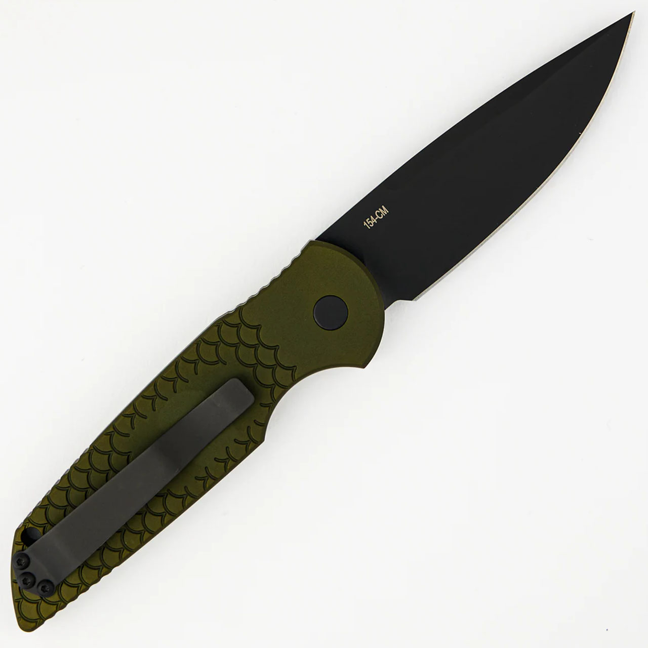 This model features fish scale textured green anodized 6061-T6 aluminum handle scales. DLC drop point 154CM blade. Brand new in box.