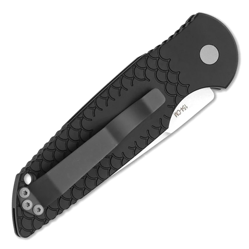 This model features fish scale machined pattern black anodized 6061-T6 aluminum handle scales. Stonewash finished 154-CM stainless steel drop point blade. Bead blast finished hardware and a black DLC finished pocket clip for tip up carry. Lanyard hole. Brand new in box.