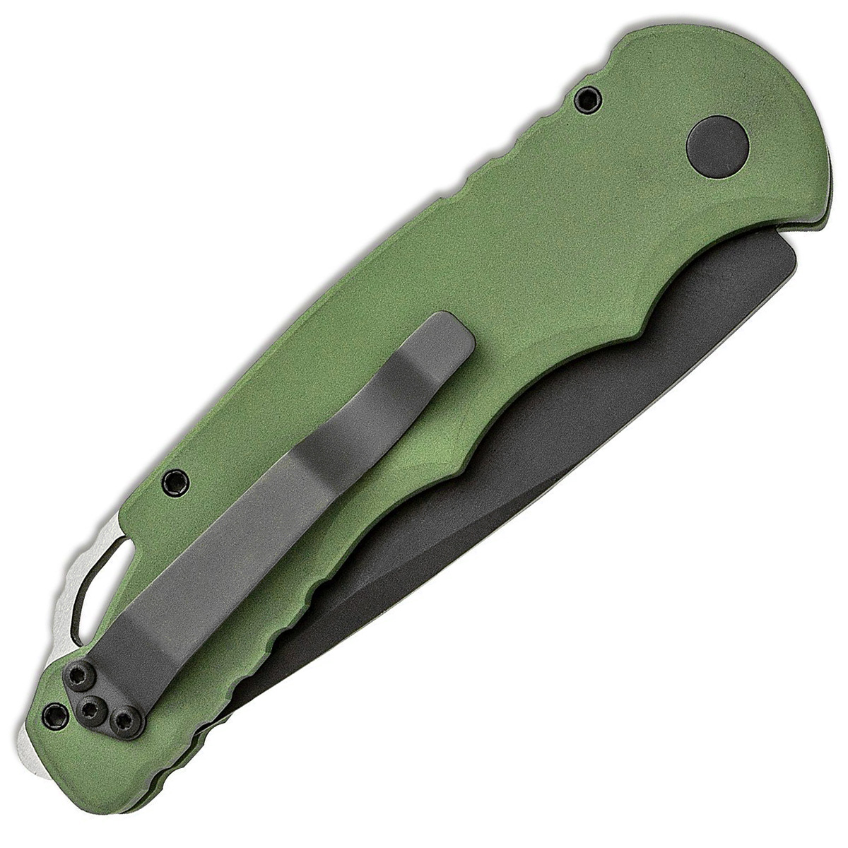 This model features a green anodized 6061-T6 aluminum handle. Black DLC finished CPM-D2 tool steel drop point blade. Two tone finished stainless steel lanyard loop/glass breaker. Black DLC finished hardware and pocket clip for tip up carry. The blade is marked with the Pro-Tech logo and model information. Includes a Pro-Tech nylon sheath. Brand new in box.