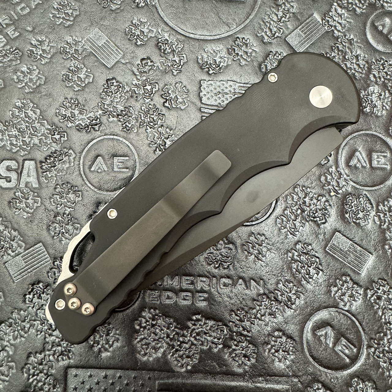 This limited model features a black anodized 6061-T6 aluminum handle with Bruce shaw designed sterling silver skull. Black DLC finished 154-CM stainless steel saber grind drop point blade. Two tone finished lanyard loop/glass breaker. Black DLC finished pocket clip for tip up carry. Abalone Button. The blade is marked with the Pro-Tech logo and model information. Brand new in box.