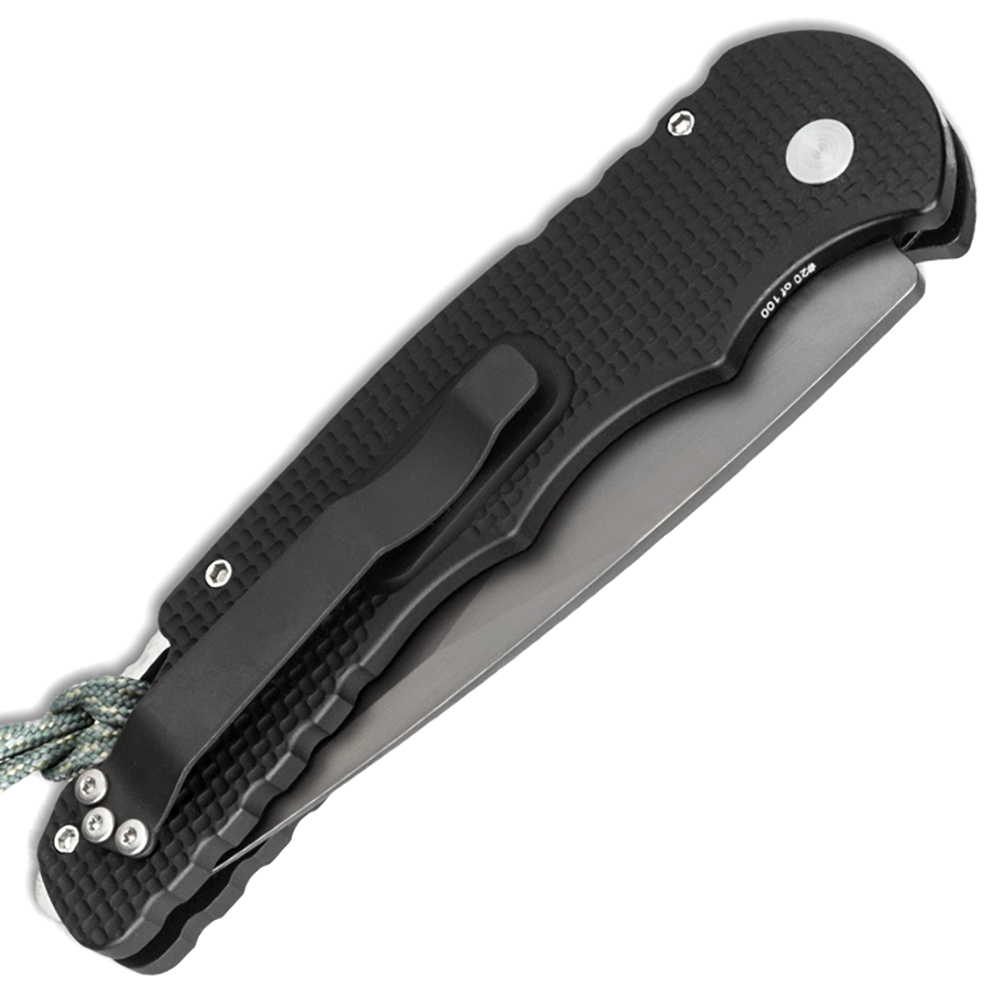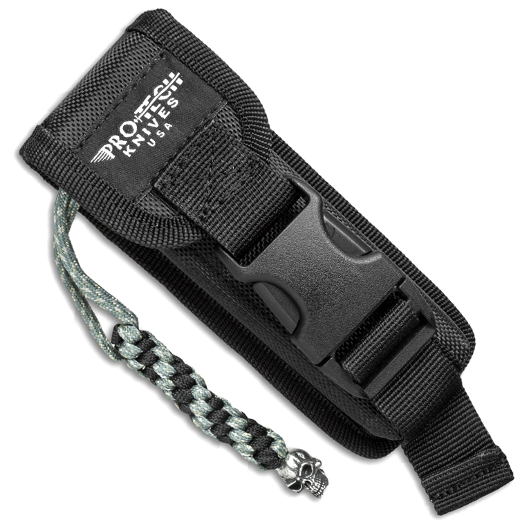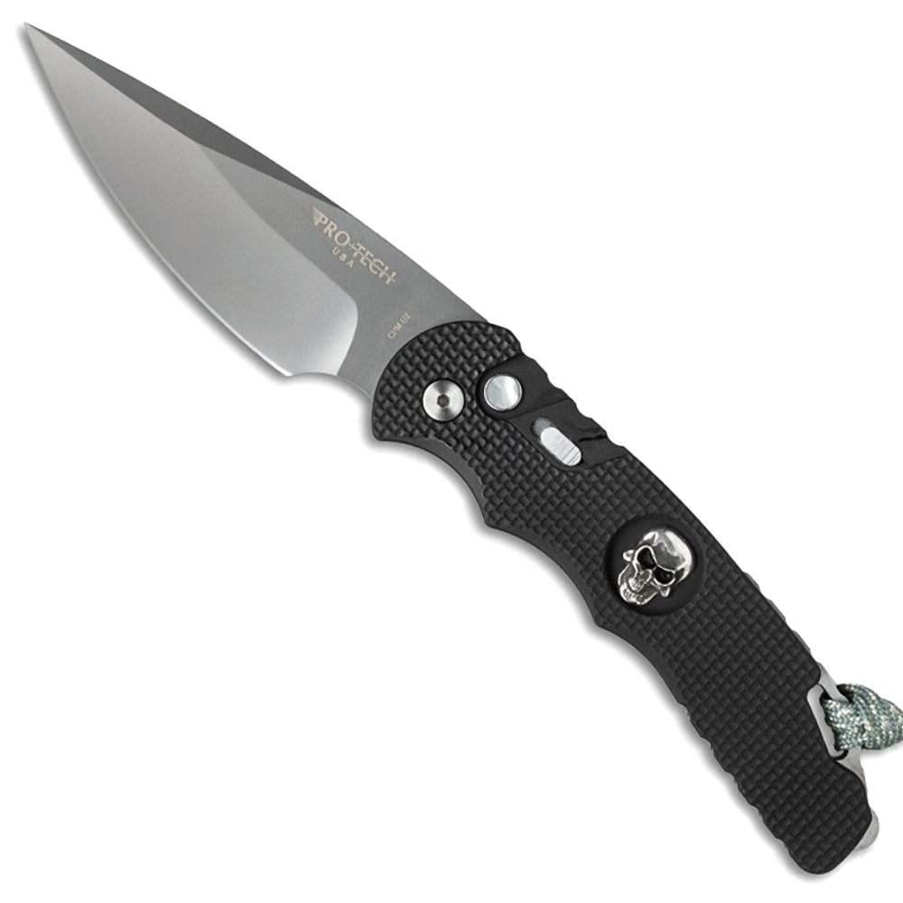This limited edition model features a super grip milled texture black anodized 6061-T6 aluminum handle with a Bruce Shaw designed .925 sterling silver skull inlaid on the front. Smoky gray DLC finished CPM-D2 tool steel drop point blade. Two tone finished stainless steel lanyard loop/glass breaker. Satin finished hardware and black DLC finished pocket clip for tip up carry. The blade is marked with the Pro-Tech logo and model information. The serial number #13 of 100 made is etched on the edge of the frame. Includes a Pro-Tech nylon sheath and Schmuckatelli skull bead lanyard. Brand new in box.