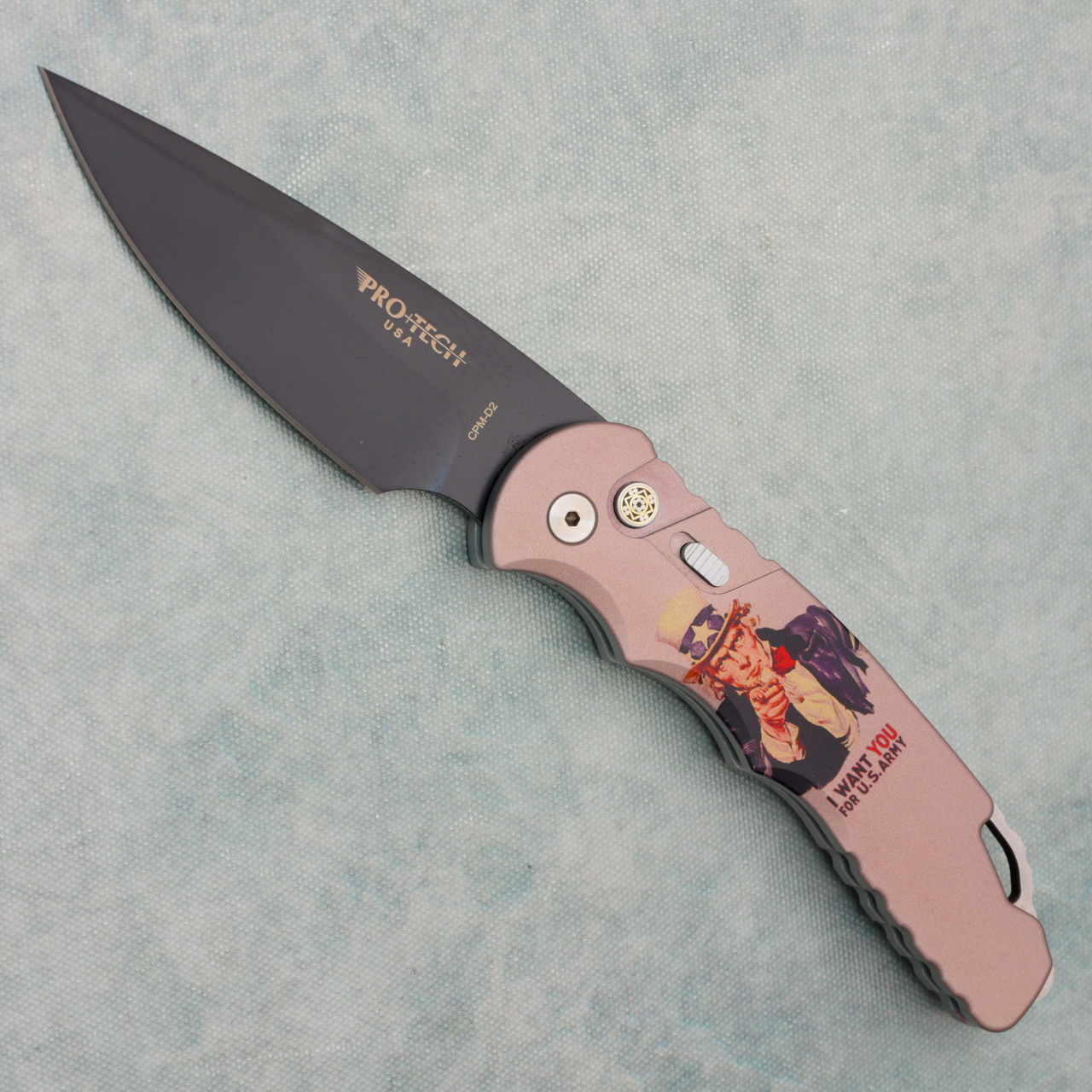 This model features Uncle Sam Army/Flag 6061-T6 aluminum handles. DLC finished D2 drop point blade. Satin finished hardware and DLC pocket clip for tip up carry. Mosaic button. The blade is marked with the Pro-Tech logo and steel. Brand new in box.