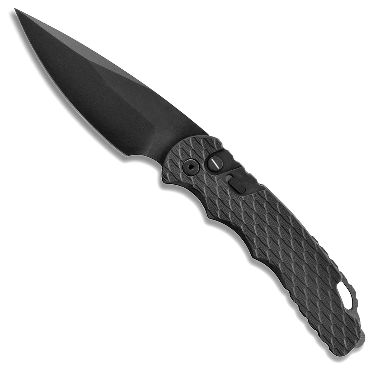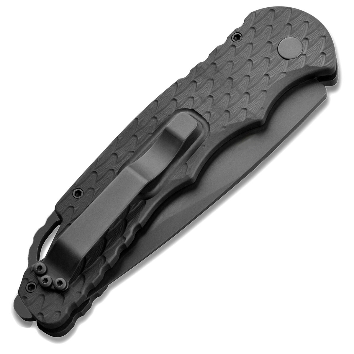 This operator series model features a feather textured black anodized 6061-T6 aluminum handle. Black DLC finished CPM-D2 tool steel drop point blade. Black DLC finished stainless steel lanyard loop/glass breaker. Black DLC finished hardware and pocket clip for tip up carry. Glow in the dark tritium inlaid push button. Totally sterile with no markings on the knife anywhere. These tactical operator verisons are awesome and sell out quickly. This particular model is the rarest in the operator lineup. Brand new in box.