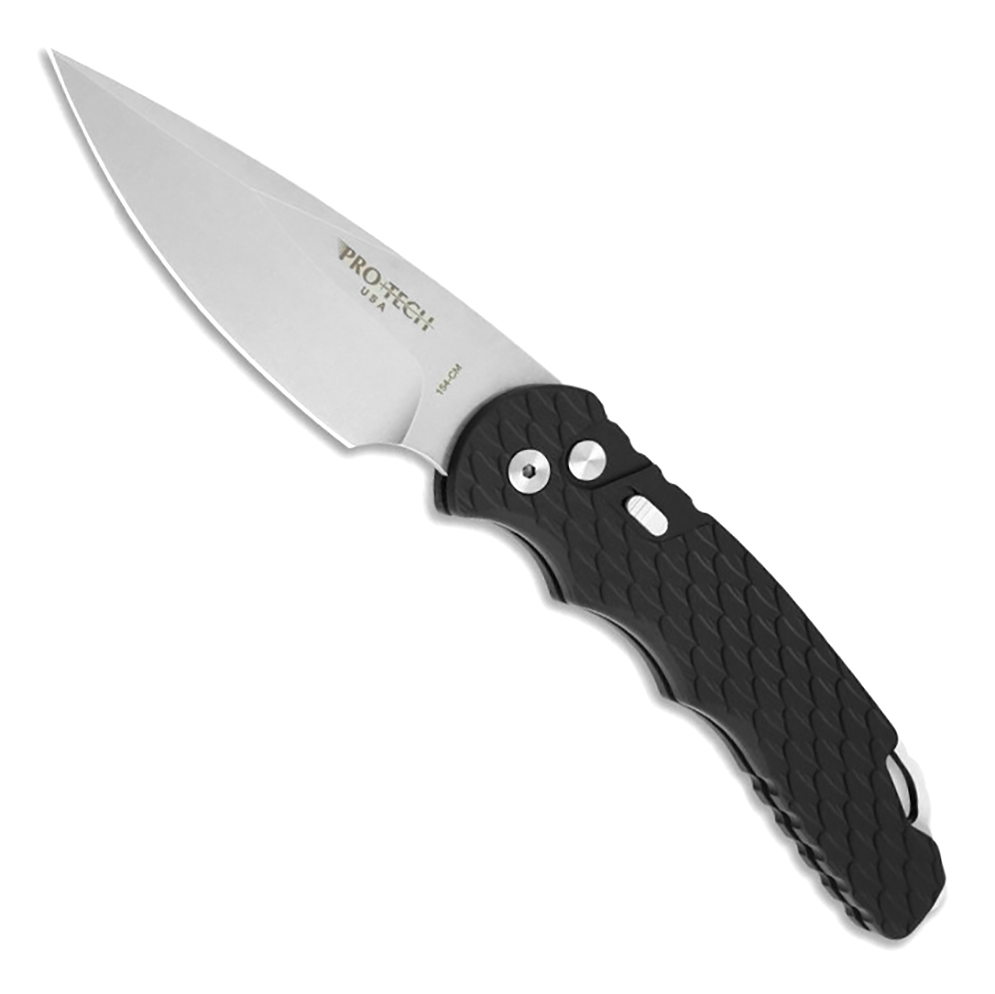 This model features a feather textured black anodized 6061-T6 aluminum handle. Stonewash finished 154-CM stainless steel drop point blade. Two tone finished lanyard loop/glass breaker. Satin finished hardware and Black DLC finished pocket clip for tip up carry. The blade is marked with the Pro-Tech logo and model information. Brand new in box with ProTech nylon sheath.