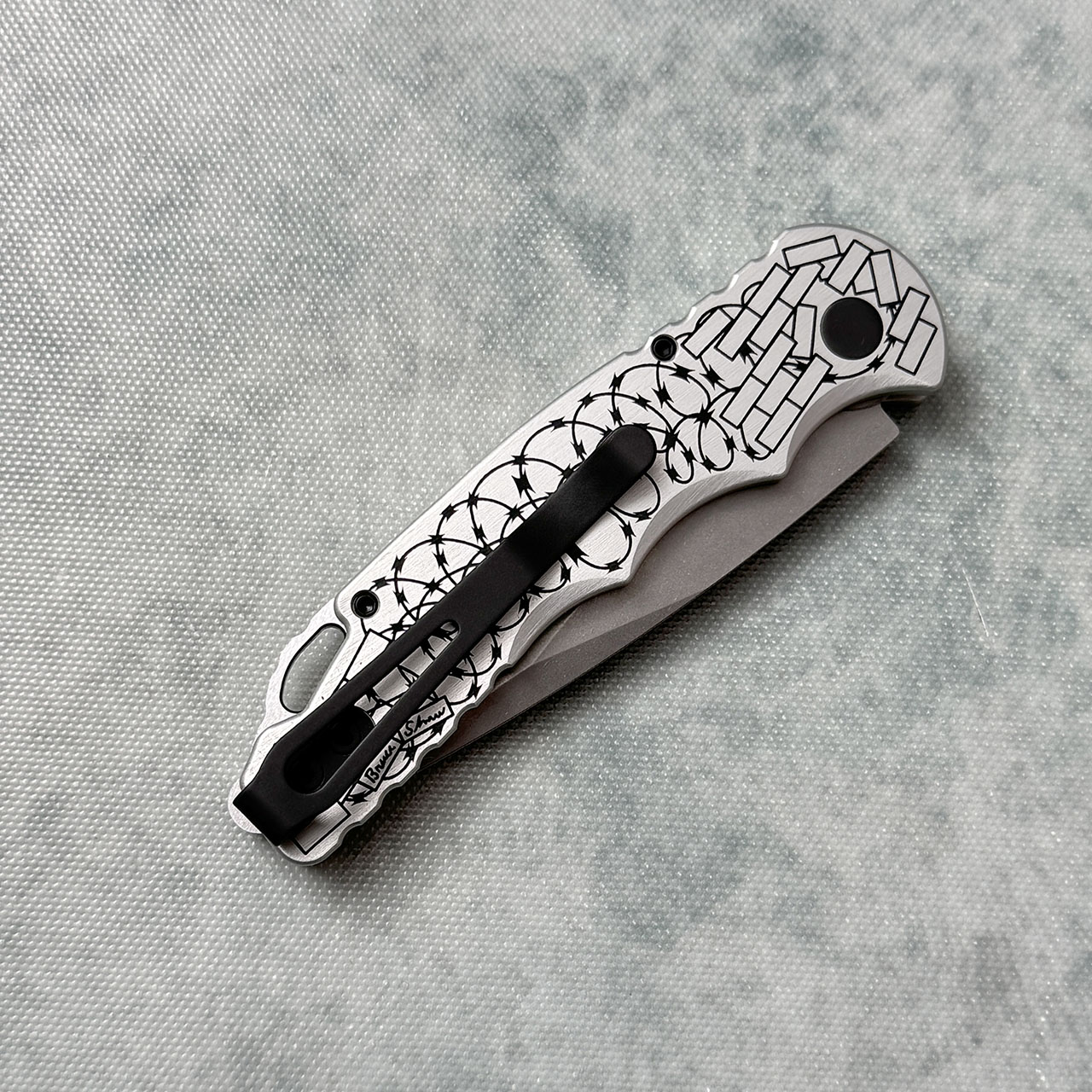 This limited edition model features a silver anodized 6061-T6 aluminum handle scales with a Bruce Shaw designed brick and barbwire theme and an inlaid Bruce Shaw .925 sterling silver skull on the front. Stonewash finished CPM-S35VN stainless steel drop point blade. The blade is marked with the Pro-Tech logo and model information. Black DLC finished hardware and pocket clip. Thumb slide button safety. Two tone DLC finished lanyard loop and glass breaker. Brand new in box.
