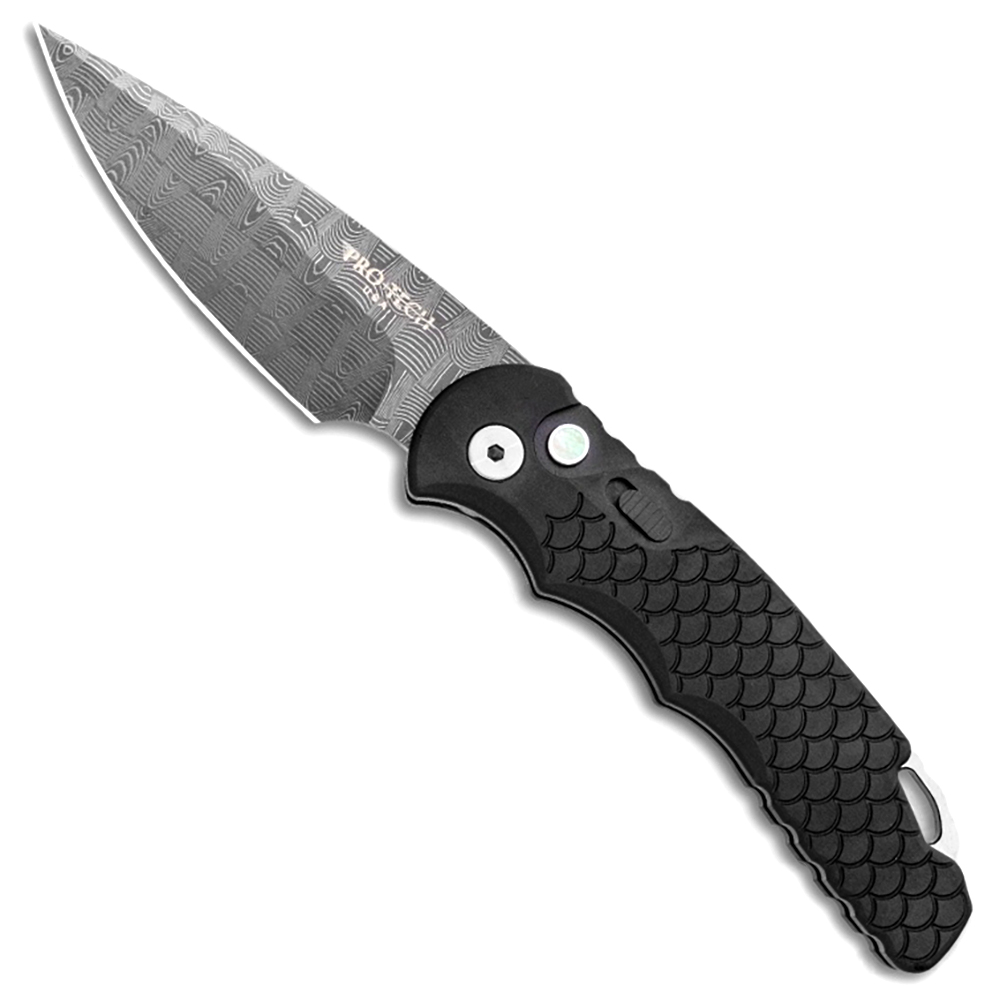 Pro-Tech TR-5 Auto Black Fish Scale Textured Handle Devin Thomas Damascus Blade Pearl Button Limited Edition