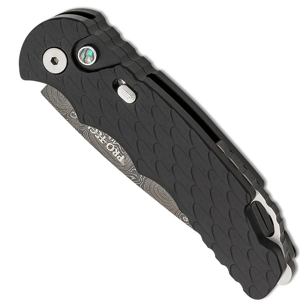 Pro-Tech TR-5 Auto Feather Textured Black Handle Damascus Blade Abalone Button Limited Edition