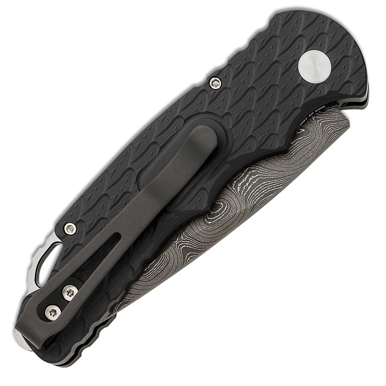 This limited edition model features fish scale textured black anodized 6061-T6 aluminum handle scales. Chad Nichols damascus drop point blade. Satin finished hardware and black DLC finished pocket clip. Two tone finished lanyard loop and glass breaker. Genuine abalone inlaid push button. The edge of the frame is etched with the serial number #xx of 100. Brand new in box.