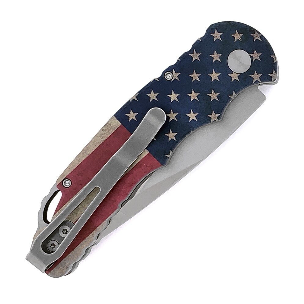 This model features PK Vintage Flag anodized 6061-T6 aluminum handle scales. Satin finished CPM-S35VN stainless steel drop point blade. Satin finished hardware. Polished pocket clip. Two tone satin / DLC finished lanyard loop and glass breaker. Gold lip pearl inlaid push button. The serial number is etched on the frame edge. Brand new in black ProTech presentation box.